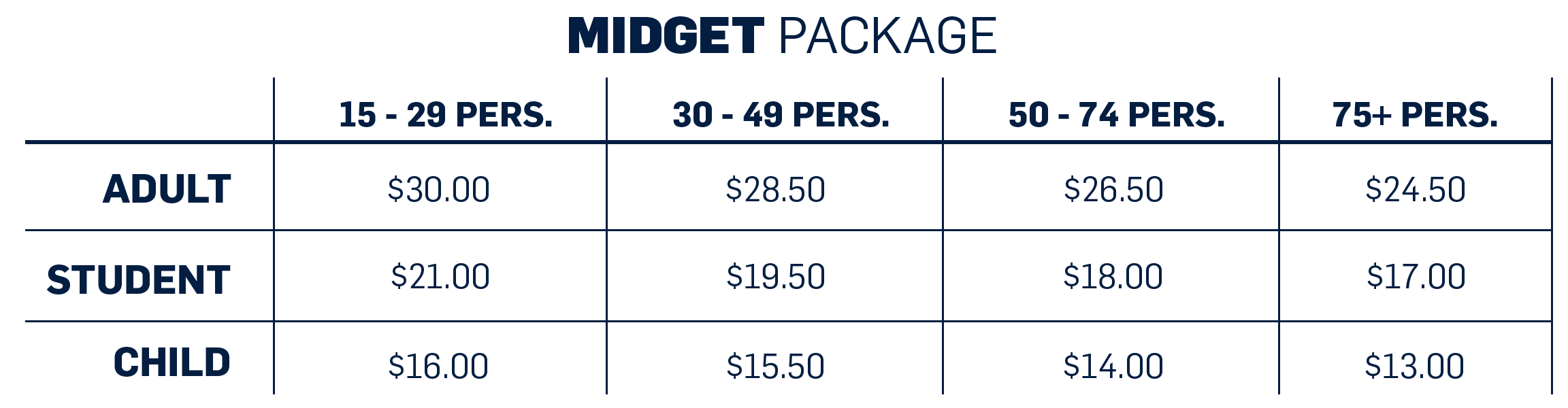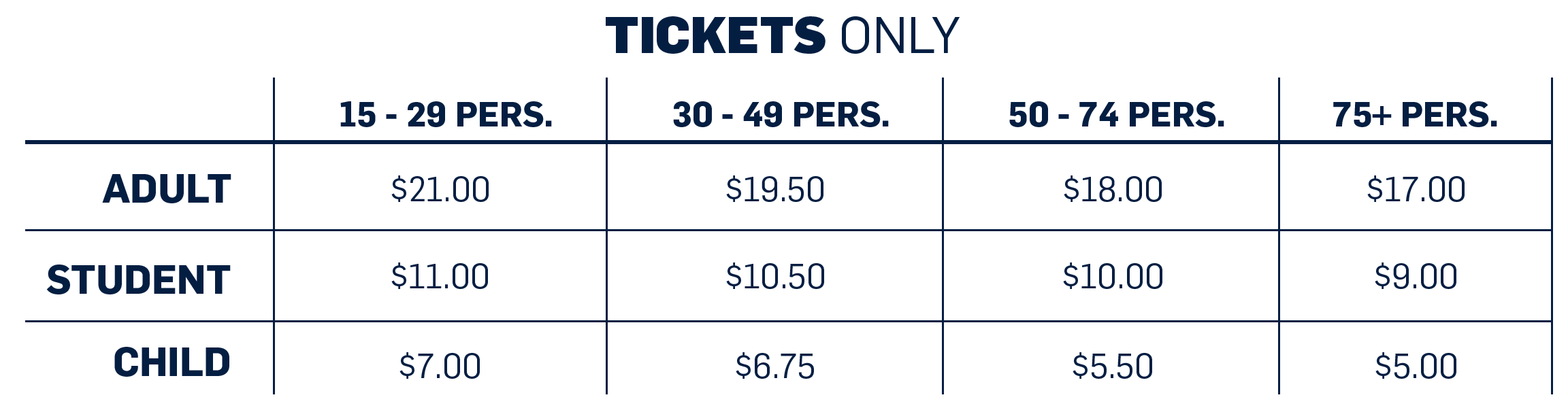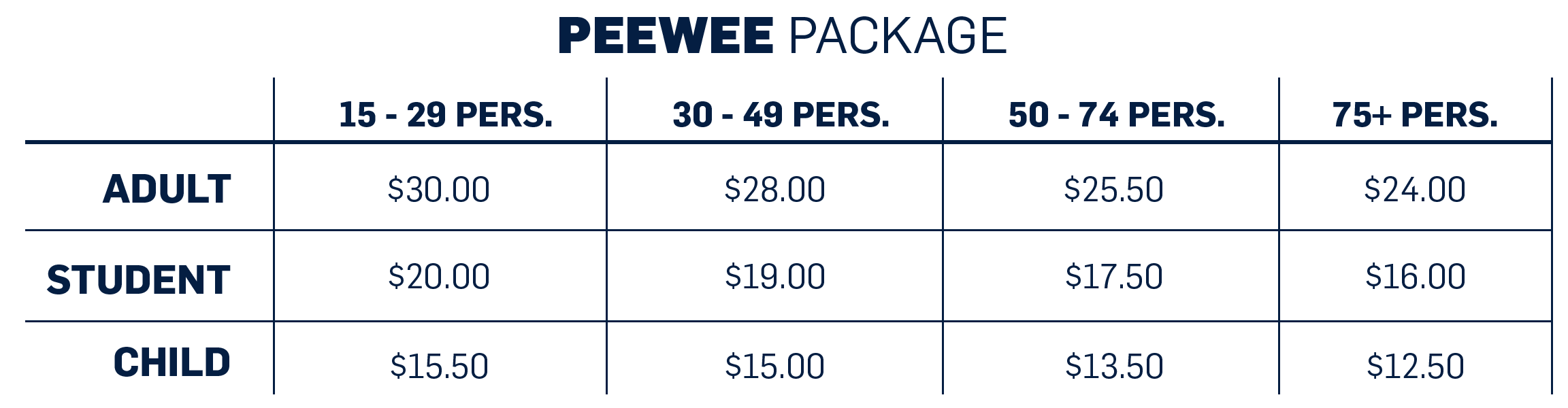 The BANTAM package is $14 per ticket for all groups (15-75+ people) of the Student category.
