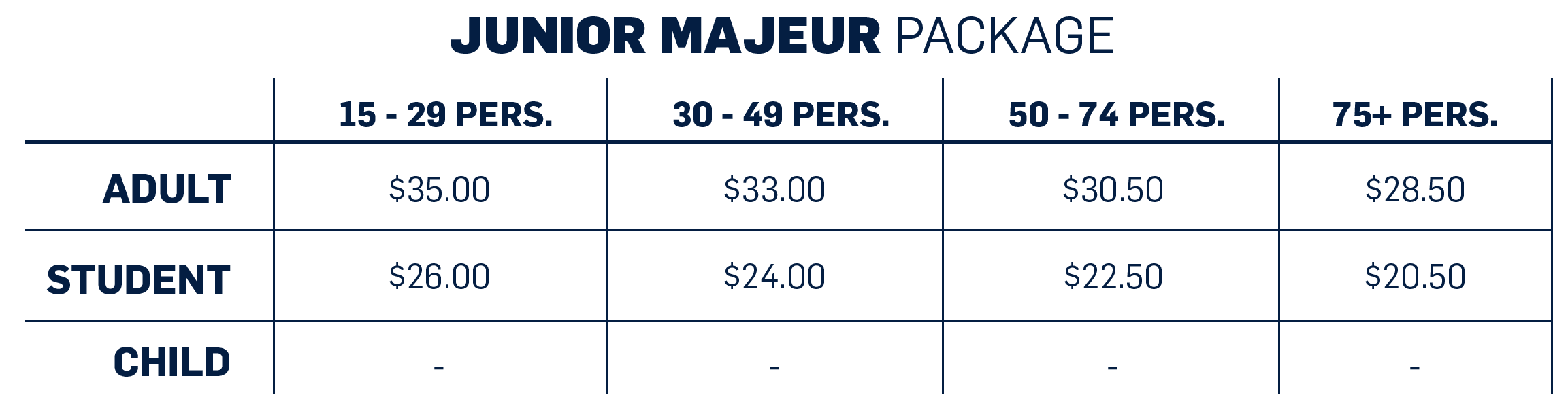 The JUNIOR MAJEUR package is $25 per ticket for groups of the Student category between 15-29 people.