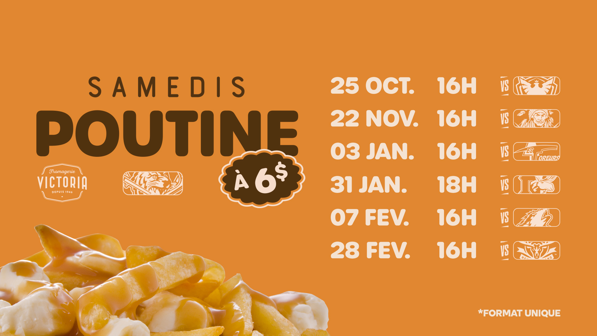 Les samedis, notre partenaire la Fromagerie Victoria vous offre la poutine (format unique) pour seulement 6$ dans les restaurants du Colisée Desjardins ! C’est le temps de vous régaler !