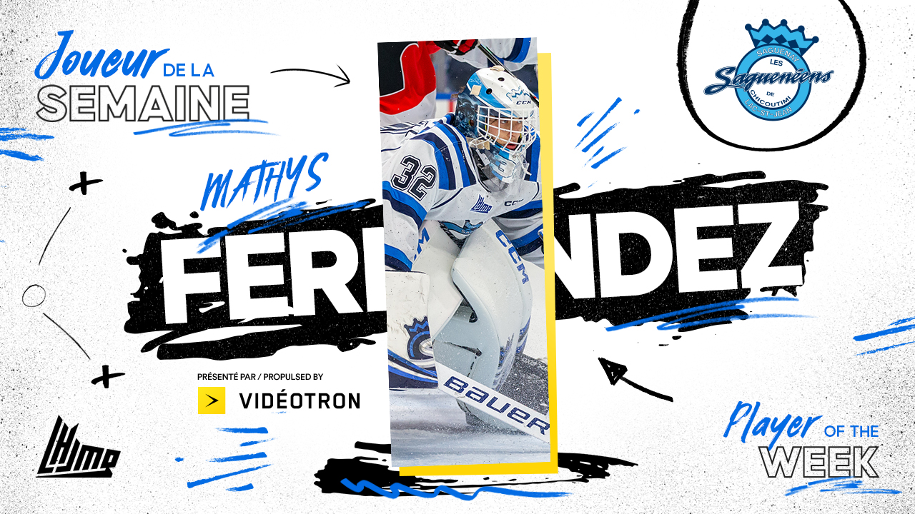 Le plus récent Joueur de la semaine Vidéotron dans la LHJMQ est le gardien de but des Saguenéens de Chicoutimi, Mathys Fernandez. Le Blainvillois de 18 ans a conclu la semaine avec une fiche de 3-0-0-0, une moyenne de buts alloués de 1.00, un pourcentage d’arrêts de 0.963% et un jeu blanc pour aider les Sags à grimper dans le classement de l’Association Est.