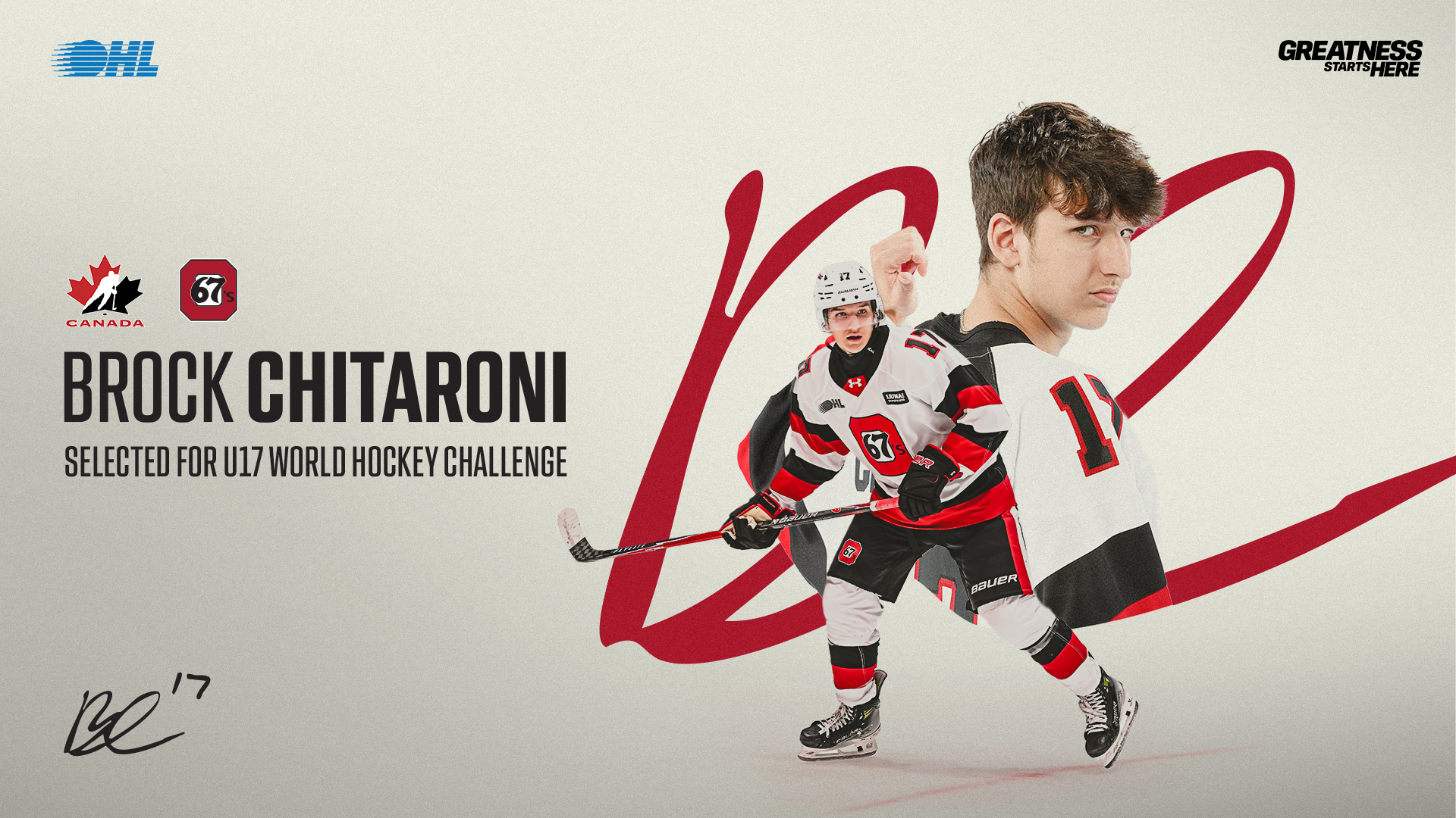 OTTAWA – The Ottawa 67’s will have one player competing in this year’s U17 World Challenge in Truro, Nova Scotia, from October 31 to November 8, forward Brock Chitaroni suiting up for Team Canada White.