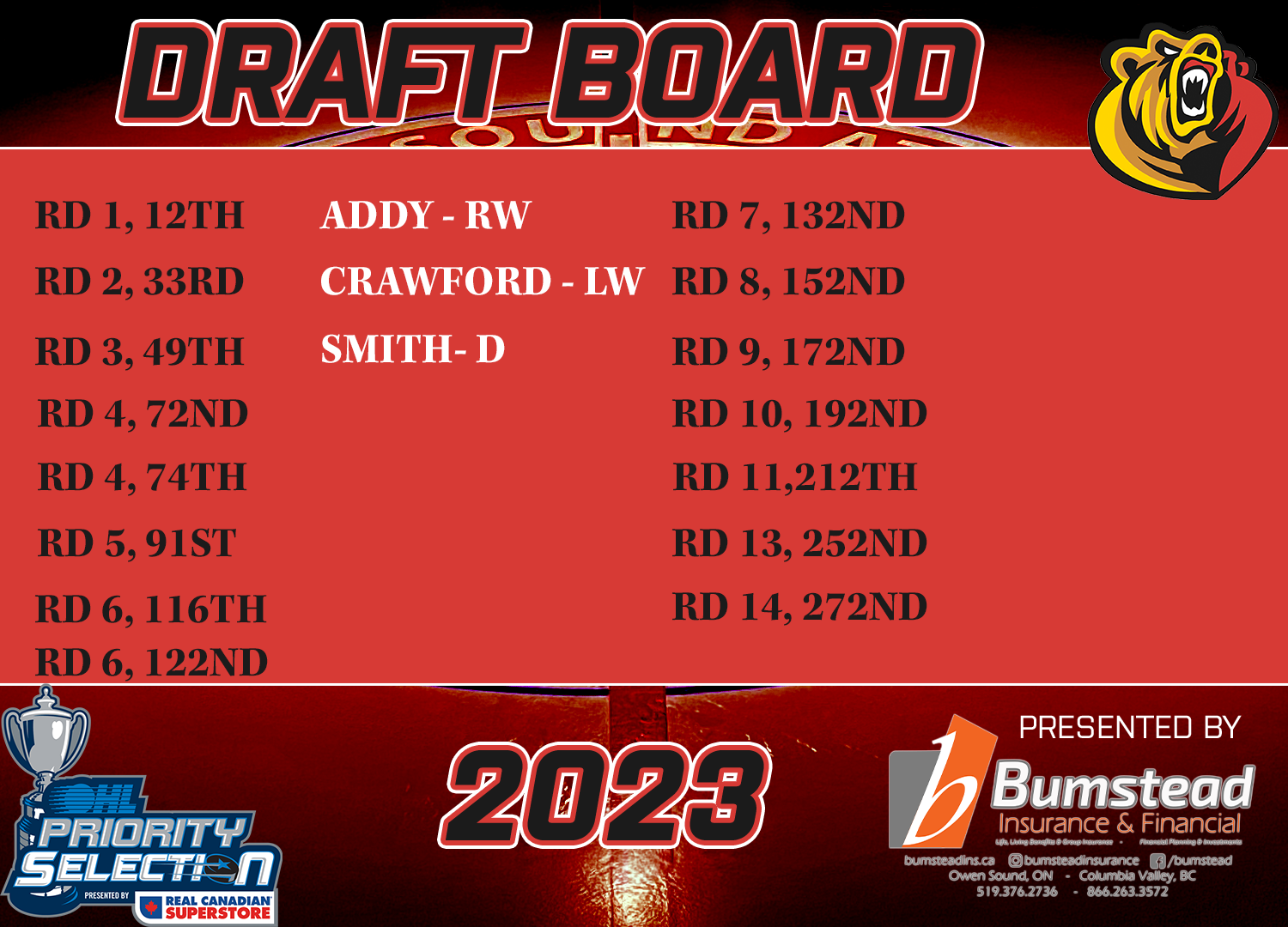 Day 2 of the 2023 OHL Priority Selection presented by Real Canadian Superstore will continue on Saturday, April 22nd beginning at 9am for rounds 4-15. Stay tuned to @AttackOHL social media feeds and attackhockey.com for Attack at the Draft coverage presented by Bumstead Financial & Insurance.