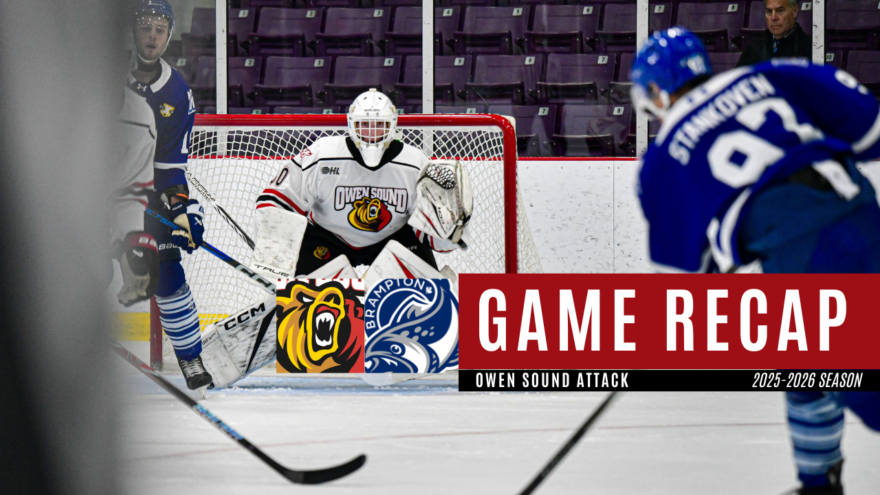The Owen Sound Attack headed down highway 10 on Friday night to Brampton to take on the Steelheads in their third game of the pre-season. The Attack came away on the wrong side of a 6-2 deficit. Tristan Delisle and Nicholas Sykora found the back of the net, while Julian Demiglio had 2 goals, and David Green, Justin Bottineau, Mason Zebeski and Matej Stankoven had singles for the Steelheads. Trenten Bennett played the entire game for the Attack, making 28 saves in the loss.
