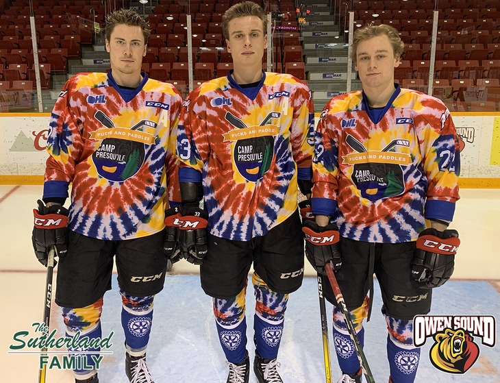 The ‘Pucks and Paddles’ game night is in support of Camp Presqu’ile, a not-for-profit camp located outside of Owen Sound run by the Owen Sound Rotary Club. Camp counsellors at Presqu’ile wear tie dyed sweaters all summer, and the Owen Sound Attack donned their own tie dyed sweaters on this Saturday night. These one of a kind jerseys were auctioned off after the game to raise money for Camp Presqu’ile.
