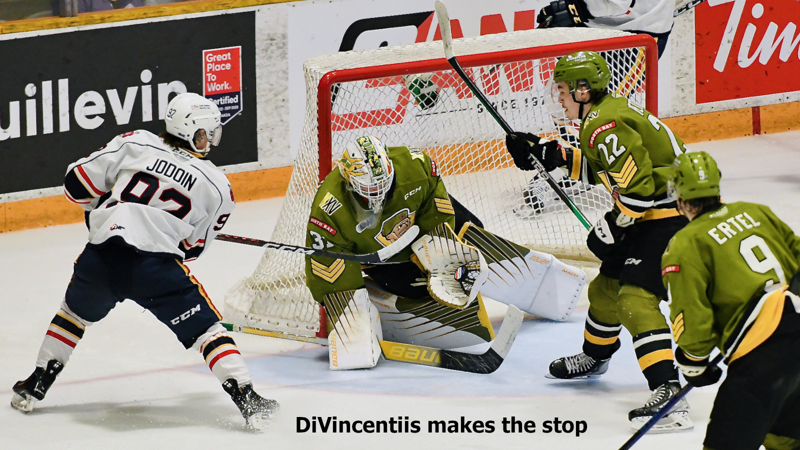Kyle Jackson had one goal and one assist and Liam Arnsby and Pasquale Zito, into an empty net, each provided a goal for second-place North Bay, while goaltender Dom DiVincentiis made 32 saves before a Memorial Gardens crowd of 3,460.