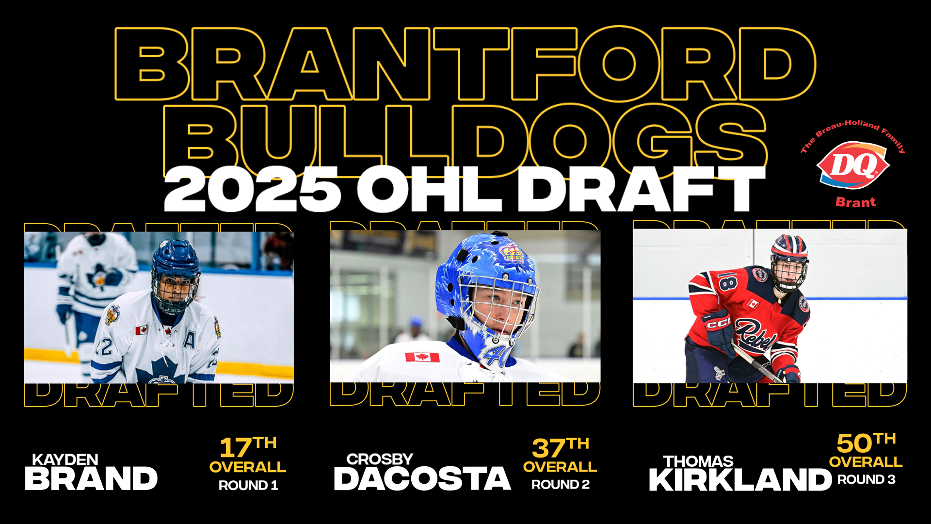 The Brantford Bulldogs are excited to welcome Kayden, Crosby & Thomas and look forward to seeing them take the ice for the first time in Black & Gold.