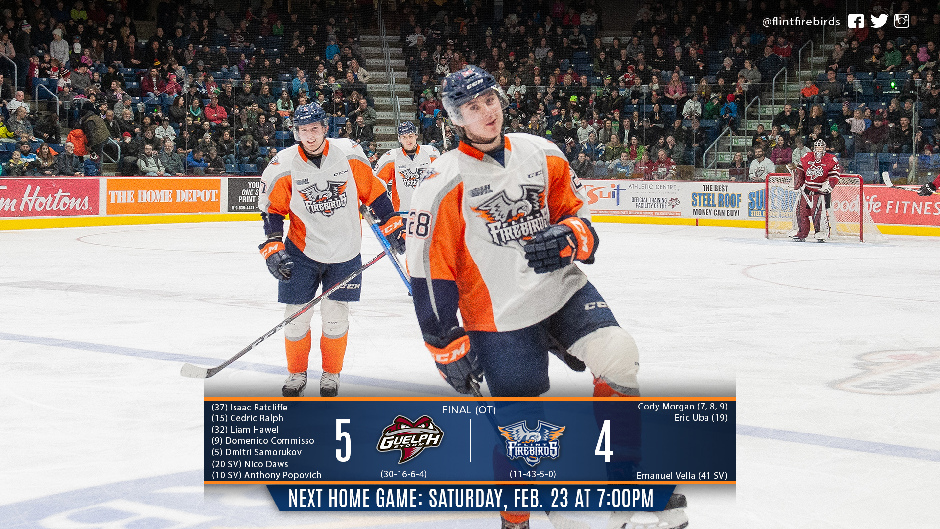 {"league":"ohl","site_api_key":"2976319eb44abe94","season":"","sponsor":"https:\/\/d36mmqcww1zunu.cloudfront.net\/wp-content\/uploads\/sites\/25\/2023\/08\/17141541\/thumbnail_tickets-here-2.png","link":"https:\/\/chl.ca\/ohl-firebirds\/seasonmemberships\/","days_ahead":"6","days_back":"3","team":"13","team_class":"ohl-flnt","base_url":"https:\/\/chl.ca\/ohl-firebirds","language":"en","view":"scorebar","scoreboard":[{"ID":"28910","SeasonID":"85","league_id":"1","game_number":"4","game_letter":"G","game_type":"","quick_score":"0","Date":"2026-04-01","FloCoreEventId":"15685779","FloLiveEventId":"246920","GameDate":"Wed, Apr 1","GameDateISO8601":"2026-04-01T19:00:00-04:00","ScheduledTime":"19:00:00","ScheduledFormattedTime":"7:00 pm","Timezone":"Canada\/Eastern","TicketUrl":"https:\/\/tickets.attackhockey.com\/events\/40646-ohl-wc-qf-gm-4","HomeID":"11","HomeCode":"OS","HomeCity":"Owen Sound","HomeNickname":"Attack","HomeLongName":"Owen Sound Attack","HomeDivision":"Midwest Division","HomeGoals":"1","HomeAudioUrl":"https:\/\/bayshore.leanplayer.com\/CFOSAM","HomeVideoUrl":"https:\/\/flosports.link\/47CN8t3","HomeWebcastUrl":"https:\/\/flosports.link\/47CN8t3","VisitorID":"13","VisitorCode":"FLNT","VisitorCity":"Flint","VisitorNickname":"Firebirds","VisitorLongName":"Flint Firebirds","VisitingDivision":"West Division","VisitorGoals":"6","VisitorAudioUrl":"https:\/\/us103.com\/listen-live\/","VisitorVideoUrl":"https:\/\/flosports.link\/4mRdGvc","VisitorWebcastUrl":"https:\/\/flosports.link\/4mRdGvc","Period":"3","PeriodNameShort":"3","PeriodNameLong":"3rd","GameClock":"00:00","GameSummaryUrl":"28910","HomeWins":"0","HomeRegulationLosses":"4","HomeOTLosses":"0","HomeShootoutLosses":"0","VisitorWins":"4","VisitorRegulationLosses":"2","VisitorOTLosses":"0","VisitorShootoutLosses":"0","GameStatus":"4","Intermission":"0","GameStatusString":"Final","GameStatusStringLong":"Final","Ord":"2026-04-01 19:00:00.000000","venue_name":"Harry Lumley Bayshore Community Centre","venue_location":"Owen Sound","league_name":"Ontario Hockey League","league_code":"ohl","TimezoneShort":"EDT","HomeLogo":"https:\/\/assets.leaguestat.com\/ohl\/logos\/11.png","VisitorLogo":"https:\/\/assets.leaguestat.com\/ohl\/logos\/13.png","FloHockeyUrl":"https:\/\/flohockey.tv\/events\/15685779","combined_client_code":null},{"ID":"28956","SeasonID":"85","league_id":"1","game_number":"1","game_letter":"L","game_type":"","quick_score":"0","Date":"2026-04-10","FloCoreEventId":"15763073","FloLiveEventId":"248047","GameDate":"Fri, Apr 10","GameDateISO8601":"2026-04-10T19:05:00-04:00","ScheduledTime":"19:05:00","ScheduledFormattedTime":"7:05 pm","Timezone":"Canada\/Eastern","TicketUrl":"https:\/\/wfcucentre.evenue.net\/event\/S26\/R2G1","HomeID":"17","HomeCode":"WSR","HomeCity":"Windsor","HomeNickname":"Spitfires","HomeLongName":"Windsor Spitfires","HomeDivision":"West Division","HomeGoals":"4","HomeAudioUrl":"https:\/\/www.iheart.com\/live\/am-800-cklw-7476\/","HomeVideoUrl":"https:\/\/flosports.link\/4mRdGvc","HomeWebcastUrl":"https:\/\/flosports.link\/4mRdGvc","VisitorID":"13","VisitorCode":"FLNT","VisitorCity":"Flint","VisitorNickname":"Firebirds","VisitorLongName":"Flint Firebirds","VisitingDivision":"West Division","VisitorGoals":"2","VisitorAudioUrl":"https:\/\/us103.com\/listen-live\/","VisitorVideoUrl":"https:\/\/flosports.link\/4mRdGvc","VisitorWebcastUrl":"https:\/\/flosports.link\/4mRdGvc","Period":"3","PeriodNameShort":"3","PeriodNameLong":"3rd","GameClock":"00:00","GameSummaryUrl":"28956","HomeWins":"6","HomeRegulationLosses":"0","HomeOTLosses":"0","HomeShootoutLosses":"0","VisitorWins":"4","VisitorRegulationLosses":"2","VisitorOTLosses":"0","VisitorShootoutLosses":"0","GameStatus":"4","Intermission":"0","GameStatusString":"Final","GameStatusStringLong":"Final","Ord":"2026-04-10 19:05:00.000000","venue_name":"WFCU Centre","venue_location":"Windsor","league_name":"Ontario Hockey League","league_code":"ohl","TimezoneShort":"EDT","HomeLogo":"https:\/\/assets.leaguestat.com\/ohl\/logos\/17.png","VisitorLogo":"https:\/\/assets.leaguestat.com\/ohl\/logos\/13.png","FloHockeyUrl":"https:\/\/flohockey.tv\/events\/15763073","combined_client_code":null},{"ID":"28957","SeasonID":"85","league_id":"1","game_number":"2","game_letter":"L","game_type":"","quick_score":"0","Date":"2026-04-12","FloCoreEventId":"15763136","FloLiveEventId":"248072","GameDate":"Sun, Apr 12","GameDateISO8601":"2026-04-12T16:05:00-04:00","ScheduledTime":"16:05:00","ScheduledFormattedTime":"4:05 pm","Timezone":"Canada\/Eastern","TicketUrl":"https:\/\/wfcucentre.evenue.net\/event\/S26\/R2G2","HomeID":"17","HomeCode":"WSR","HomeCity":"Windsor","HomeNickname":"Spitfires","HomeLongName":"Windsor Spitfires","HomeDivision":"West Division","HomeGoals":"6","HomeAudioUrl":"https:\/\/www.iheart.com\/live\/am-800-cklw-7476\/","HomeVideoUrl":"https:\/\/flosports.link\/4mRdGvc","HomeWebcastUrl":"https:\/\/flosports.link\/4mRdGvc","VisitorID":"13","VisitorCode":"FLNT","VisitorCity":"Flint","VisitorNickname":"Firebirds","VisitorLongName":"Flint Firebirds","VisitingDivision":"West Division","VisitorGoals":"5","VisitorAudioUrl":"https:\/\/us103.com\/listen-live\/","VisitorVideoUrl":"https:\/\/flosports.link\/4mRdGvc","VisitorWebcastUrl":"https:\/\/flosports.link\/4mRdGvc","Period":"3","PeriodNameShort":"3","PeriodNameLong":"3rd","GameClock":"00:00","GameSummaryUrl":"28957","HomeWins":"6","HomeRegulationLosses":"0","HomeOTLosses":"0","HomeShootoutLosses":"0","VisitorWins":"4","VisitorRegulationLosses":"2","VisitorOTLosses":"0","VisitorShootoutLosses":"0","GameStatus":"4","Intermission":"0","GameStatusString":"Final","GameStatusStringLong":"Final","Ord":"2026-04-12 16:05:00.000000","venue_name":"WFCU Centre","venue_location":"Windsor","league_name":"Ontario Hockey League","league_code":"ohl","TimezoneShort":"EDT","HomeLogo":"https:\/\/assets.leaguestat.com\/ohl\/logos\/17.png","VisitorLogo":"https:\/\/assets.leaguestat.com\/ohl\/logos\/13.png","FloHockeyUrl":"https:\/\/flohockey.tv\/e