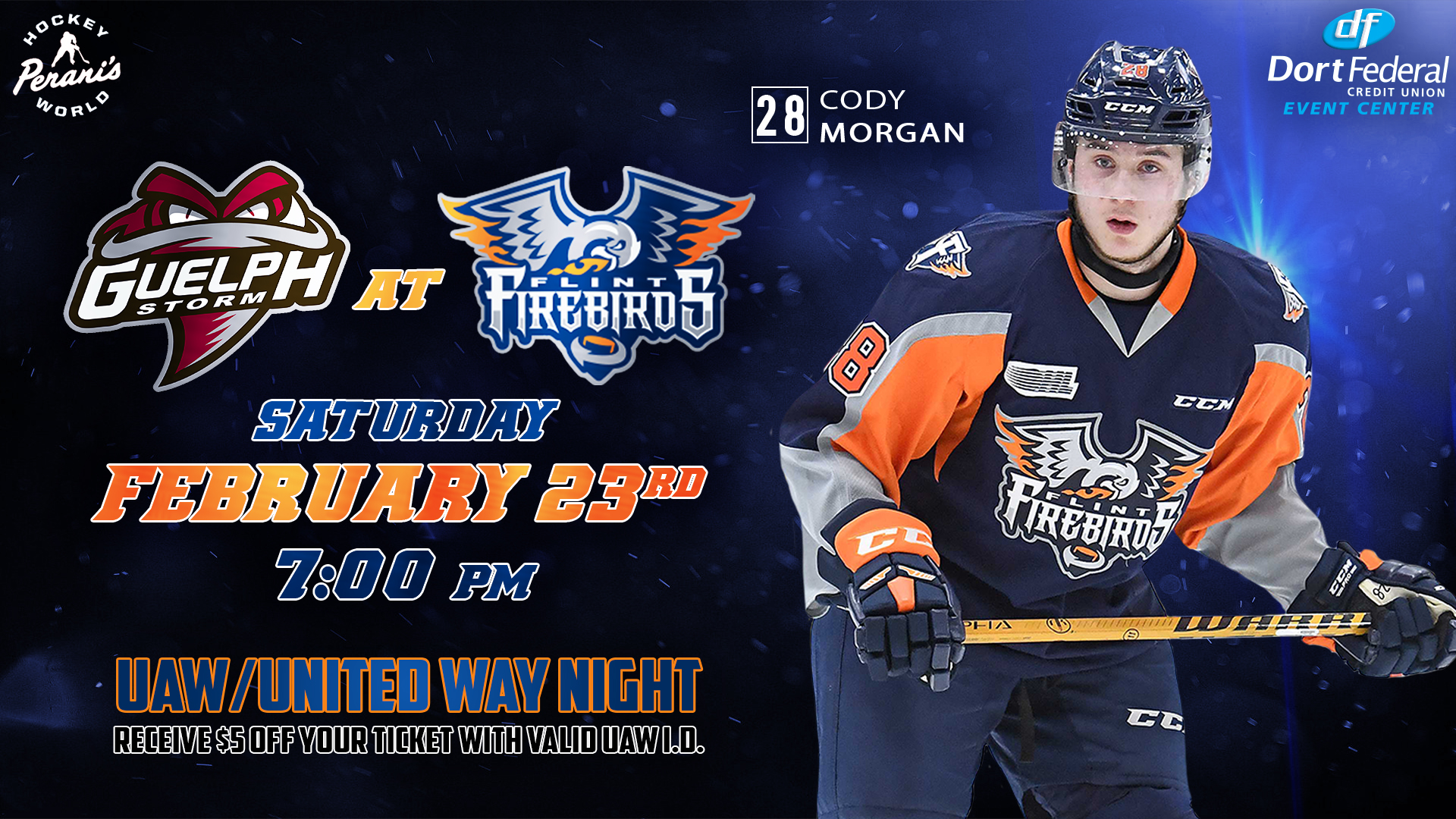 Flint, Mich. – The Firebirds will return home to the Dort Federal Credit Union Event Center this Saturday, Feb. 23. when the club hosts the Guelph Storm. Puck drop is set for 7 p.m. (ET) for the Firebirds’ 4th-annual United Auto Workers (UAW) / United Way Night.