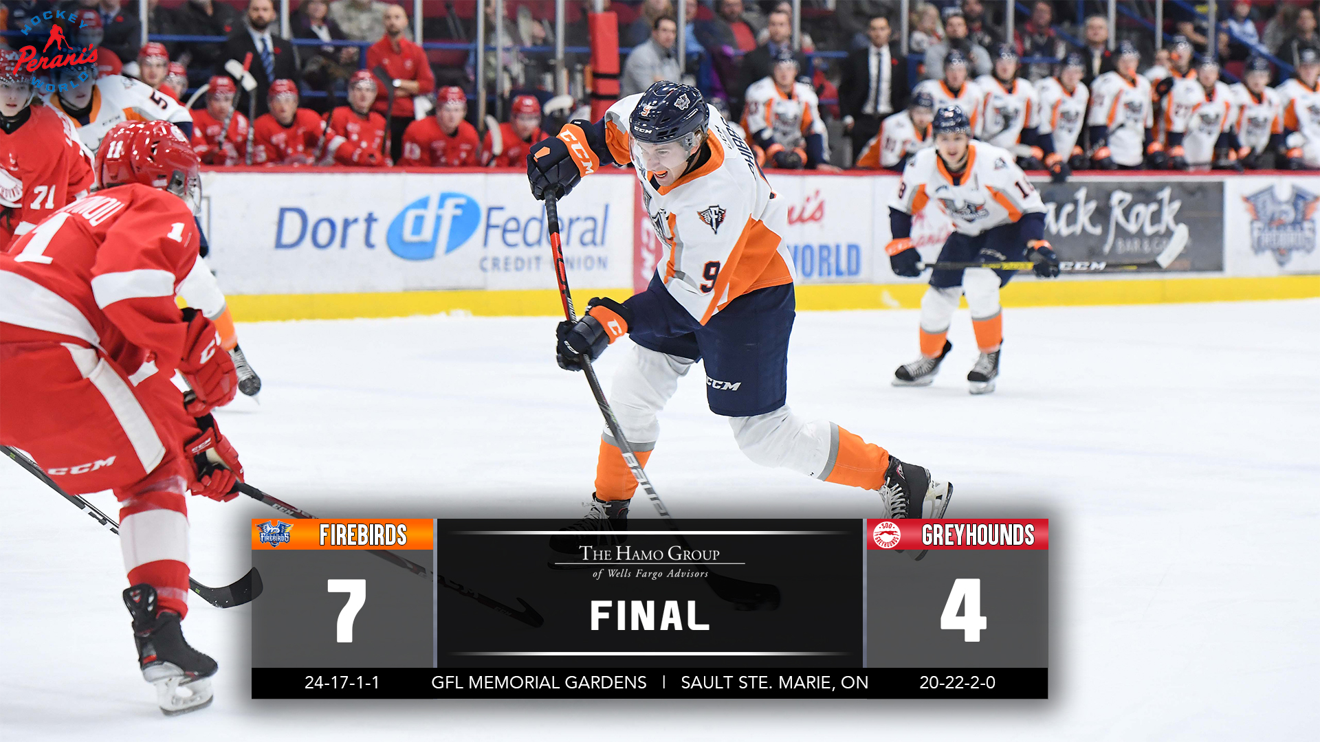 Sault Ste. Marie, Ont. – Both Ty Dellandrea (Dallas Stars) and Riley Piercey recorded four-point games Wednesday and Anthony Popovich made 28 saves on 32 shots to propel the Firebirds to a 7-4 victory over the Sault Ste. Marie Greyhounds in front of 3,767 fans at the GFL Memorial Gardens. The Firebirds have now won two-straight games and have picked up points in 4 of their last 5 contests, earning 7 of 10 possible points in that time.
