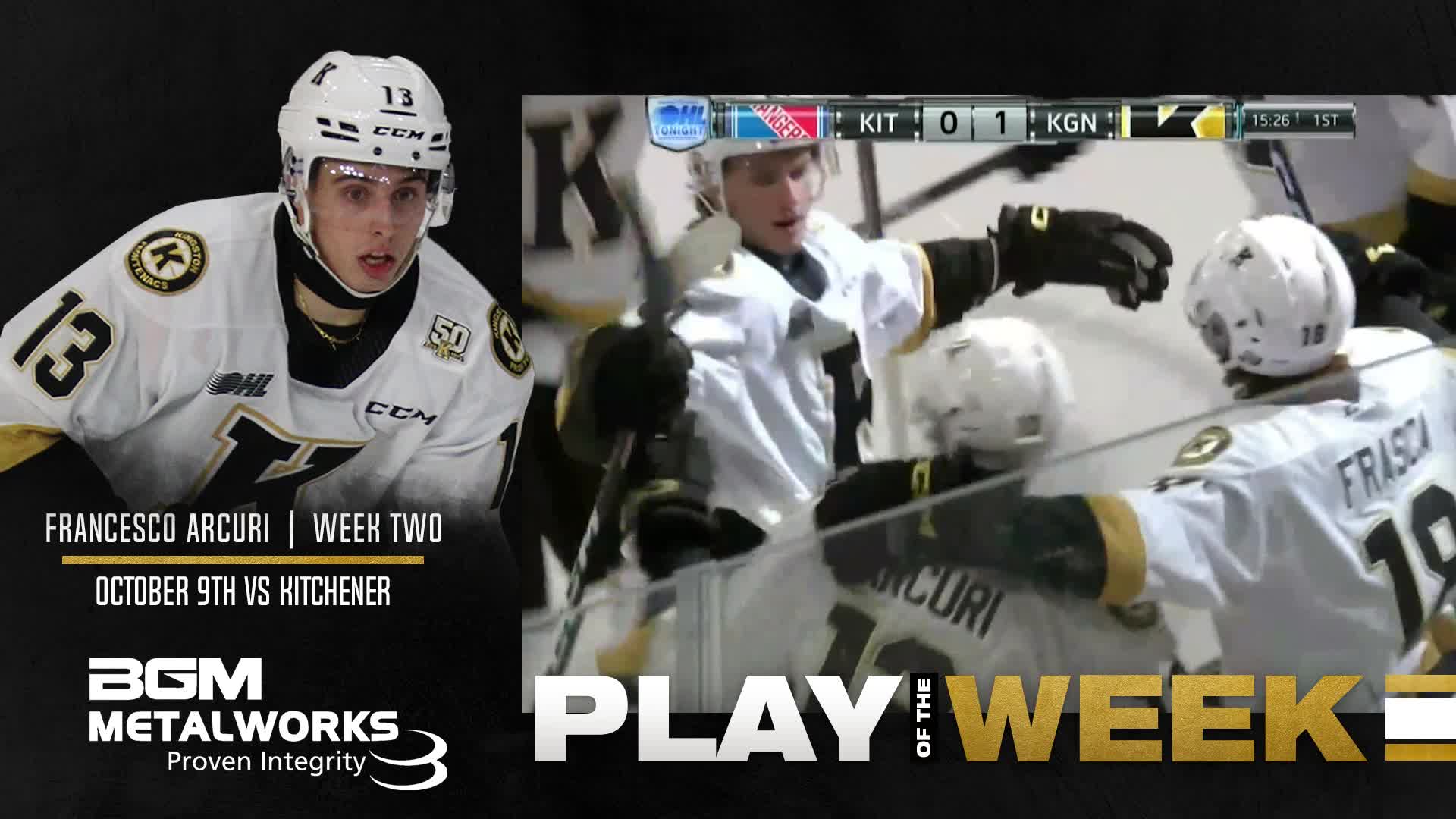 Francesco Arcuri, Linus Hemström and Gabriel Frasca take home the Play of the Week for their play on Sunday, October 9th versus the Kitchener Rangers. Arcuri scored off a great passing play by Hemström and Frasca.