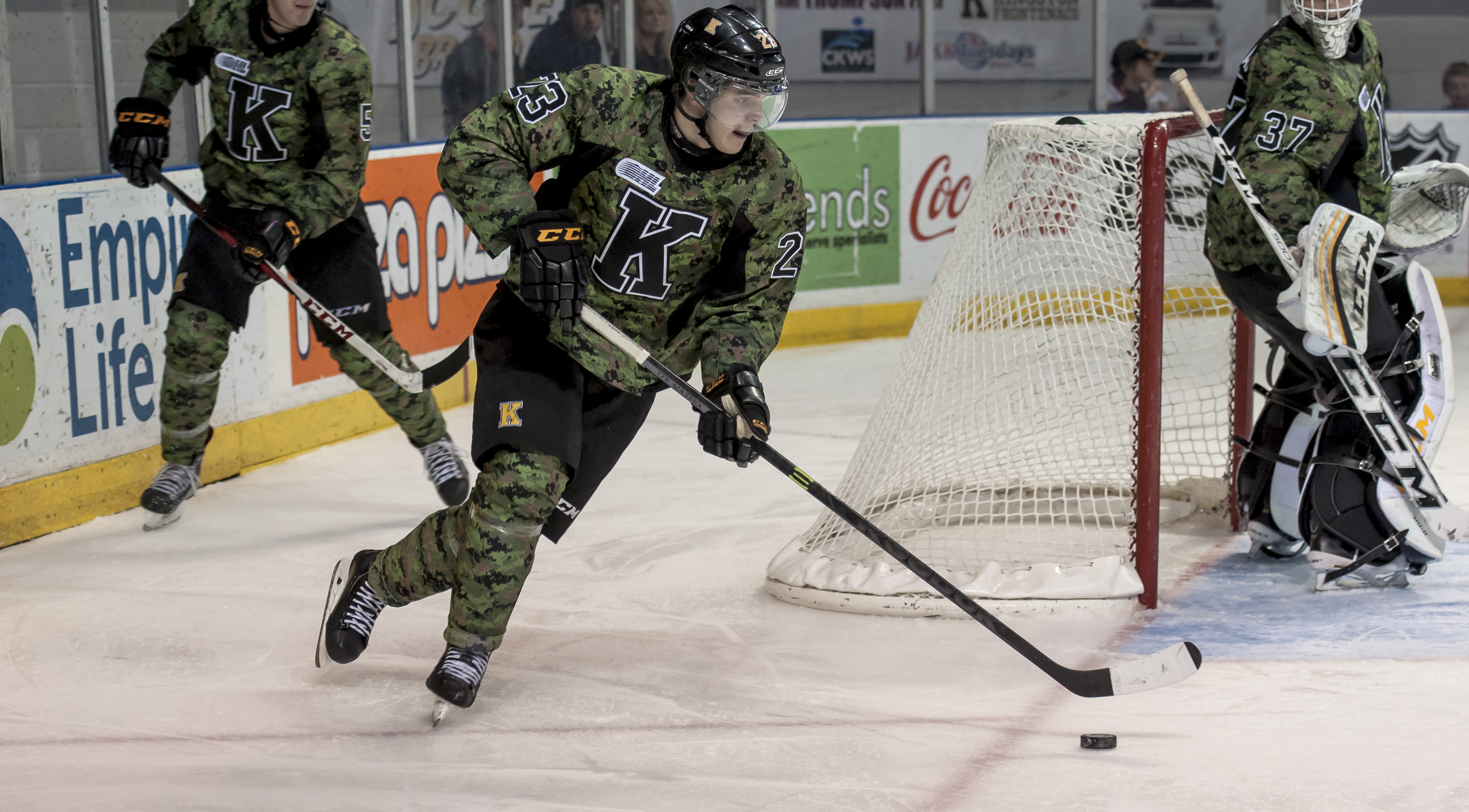 The Kingston Frontenacs, clad in their unique camo jerseys on Military Appreciation Night, added a full-out offensive attack on the Belleville Bulls.