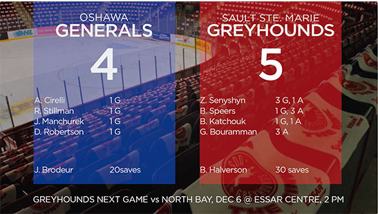 {"league":"ohl","site_api_key":"2976319eb44abe94","season":"","sponsor":"https:\/\/media.chl.ca\/wp-content\/uploads\/sites\/57\/2023\/10\/11120729\/HIE-SSM-Master-Logo-Colour4.png","link":false,"days_ahead":"6","days_back":"1","team":"16","team_class":"ohl-soo","base_url":"https:\/\/chl.ca\/ohl-greyhounds","language":"en","view":"scorebar","scoreboard":[{"ID":"28428","SeasonID":"83","league_id":"1","game_number":"279","game_letter":"","game_type":"","quick_score":"0","Date":"2025-12-05","FloCoreEventId":"14477369","FloLiveEventId":"194484","GameDate":"Fri, Dec 5","GameDateISO8601":"2025-12-05T19:07:00-05:00","ScheduledTime":"19:07:00","ScheduledFormattedTime":"7:07 pm","Timezone":"Canada\/Eastern","TicketUrl":"","HomeID":"16","HomeCode":"SOO","HomeCity":"Sault Ste. Marie","HomeNickname":"Greyhounds","HomeLongName":"Soo Greyhounds","HomeDivision":"West Division","HomeGoals":"11","HomeAudioUrl":"https:\/\/streamdb8web.securenetsystems.net\/cirruscontent\/WSUE","HomeVideoUrl":"","HomeWebcastUrl":"https:\/\/flosports.link\/4oJ5rTq","VisitorID":"4","VisitorCode":"OSH","VisitorCity":"Oshawa","VisitorNickname":"Generals","VisitorLongName":"Oshawa Generals","VisitingDivision":"East Division","VisitorGoals":"2","VisitorAudioUrl":"http:\/\/www.mixlr.com\/oshawagenerals","VisitorVideoUrl":"","VisitorWebcastUrl":"https:\/\/flosports.link\/41PjIEe","Period":"3","PeriodNameShort":"3","PeriodNameLong":"3rd","GameClock":"00:00","GameSummaryUrl":"28428","HomeWins":"17","HomeRegulationLosses":"10","HomeOTLosses":"1","HomeShootoutLosses":"1","VisitorWins":"9","VisitorRegulationLosses":"19","VisitorOTLosses":"0","VisitorShootoutLosses":"0","GameStatus":"4","Intermission":"0","GameStatusString":"Final","GameStatusStringLong":"Final","Ord":"2025-12-05 19:07:00.000000","venue_name":"GFL Memorial Gardens","venue_location":"Sault Ste. Marie, ON","league_name":"Ontario Hockey League","league_code":"ohl","TimezoneShort":"EST","HomeLogo":"https:\/\/assets.leaguestat.com\/ohl\/logos\/16.png","VisitorLogo":"https:\/\/assets.leaguestat.com\/ohl\/logos\/4.png","FloHockeyUrl":"https:\/\/flohockey.tv\/events\/14477369","combined_client_code":null},{"ID":"28439","SeasonID":"83","league_id":"1","game_number":"290","game_letter":"","game_type":"","quick_score":"0","Date":"2025-12-07","FloCoreEventId":"14477447","FloLiveEventId":"194523","GameDate":"Sun, Dec 7","GameDateISO8601":"2025-12-07T14:07:00-05:00","ScheduledTime":"14:07:00","ScheduledFormattedTime":"2:07 pm","Timezone":"Canada\/Eastern","TicketUrl":"","HomeID":"16","HomeCode":"SOO","HomeCity":"Sault Ste. Marie","HomeNickname":"Greyhounds","HomeLongName":"Soo Greyhounds","HomeDivision":"West Division","HomeGoals":"7","HomeAudioUrl":"https:\/\/streamdb8web.securenetsystems.net\/cirruscontent\/WSUE","HomeVideoUrl":"","HomeWebcastUrl":"https:\/\/flosports.link\/4oJ5rTq","VisitorID":"15","VisitorCode":"SAR","VisitorCity":"Sarnia","VisitorNickname":"Sting","VisitorLongName":"Sarnia Sting","VisitingDivision":"West Division","VisitorGoals":"3","VisitorAudioUrl":"https:\/\/chok.com\/","VisitorVideoUrl":"","VisitorWebcastUrl":"https:\/\/flosports.link\/45XHdNV","Period":"3","PeriodNameShort":"3","PeriodNameLong":"3rd","GameClock":"00:00","GameSummaryUrl":"28439","HomeWins":"17","HomeRegulationLosses":"10","HomeOTLosses":"1","HomeShootoutLosses":"1","VisitorWins":"7","VisitorRegulationLosses":"17","VisitorOTLosses":"3","VisitorShootoutLosses":"1","GameStatus":"4","Intermission":"0","GameStatusString":"Final","GameStatusStringLong":"Final","Ord":"2025-12-07 14:07:00.000000","venue_name":"GFL Memorial Gardens","venue_location":"Sault Ste. Marie, ON","league_name":"Ontario Hockey League","league_code":"ohl","TimezoneShort":"EST","HomeLogo":"https:\/\/assets.leaguestat.com\/ohl\/logos\/16.png","VisitorLogo":"https:\/\/assets.leaguestat.com\/ohl\/logos\/15.png","FloHockeyUrl":"https:\/\/flohockey.tv\/events\/14477447","combined_client_code":null},{"ID":"28443","SeasonID":"83","league_id":"1","game_number":"294","game_letter":"","game_type":"","quick_score":"0","Date":"2025-12-10","FloCoreEventId":"14477489","FloLiveEventId":"194542","GameDate":"Wed, Dec 10","GameDateISO8601":"2025-12-10T19:07:00-05:00","ScheduledTime":"19:07:00","ScheduledFormattedTime":"7:07 pm","Timezone":"Canada\/Eastern","TicketUrl":"","HomeID":"16","HomeCode":"SOO","HomeCity":"Sault Ste. Marie","HomeNickname":"Greyhounds","HomeLongName":"Soo Greyhounds","HomeDivision":"West Division","HomeGoals":"0","HomeAudioUrl":"https:\/\/streamdb8web.securenetsystems.net\/cirruscontent\/WSUE","HomeVideoUrl":"","HomeWebcastUrl":"https:\/\/flosports.link\/4oJ5rTq","VisitorID":"10","VisitorCode":"KIT","VisitorCity":"Kitchener","VisitorNickname":"Rangers","VisitorLongName":"Kitchener Rangers","VisitingDivision":"Midwest Division","VisitorGoals":"0","VisitorAudioUrl":"https:\/\/kitchener.citynews.ca\/audio\/","VisitorVideoUrl":"https:\/\/www.rogerstv.com\/waterloo-region\/onnow","VisitorWebcastUrl":"https:\/\/flosports.link\/4oHI5O7","Period":"1","PeriodNameShort":"1","PeriodNameLong":"1st","GameClock":"00:00","GameSummaryUrl":"28443","HomeWins":"17","HomeRegulationLosses":"10","HomeOTLosses":"1","HomeShootoutLosses":"1","VisitorWins":"18","VisitorRegulationLosses":"9","VisitorOTLosses":"2","VisitorShootoutLosses":"0","GameStatus":"1","Intermission":"0","GameStatusString":"7:07PM","GameStatusStringLong":"7:07 PM EST","Ord":"2025-12-10 19:07:00.000000","venue_name":"GFL Memorial Gardens","venue_location":"Sault Ste. Marie, ON","league_name":"Ontario Hockey League","league_code":"ohl","TimezoneShort":"EST","HomeLogo":"https:\/\/assets.leaguestat.com\/ohl\/logos\/16.png","VisitorLogo":"https:\/\/assets.leaguestat.com\/ohl\/logos\/10.png","FloHockeyUrl":"https:\/\/flohockey.tv\/events\/14477489","combined_client_code":null},{"ID":"28454","SeasonID":"83","league_id":"1","game_number":"305","game_letter":"","game_type":"","quick_score":"0","Date":"2025-12-12","FloCoreEventId":"14477545","FloLiveEventId":"194570","GameDate":"Fri, Dec