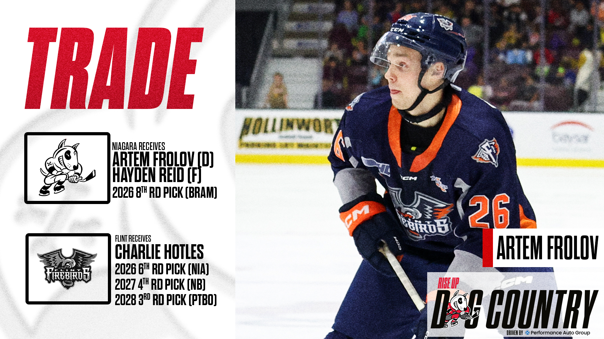 St. Catharines, ONT — The Niagara IceDogs have completed a trade with the Flint Firebirds, acquiring defenceman Artem Frolov, forward Hayden Reid, and a 2026 Draft Pick in exchange for Charlie Hotles and three draft picks.