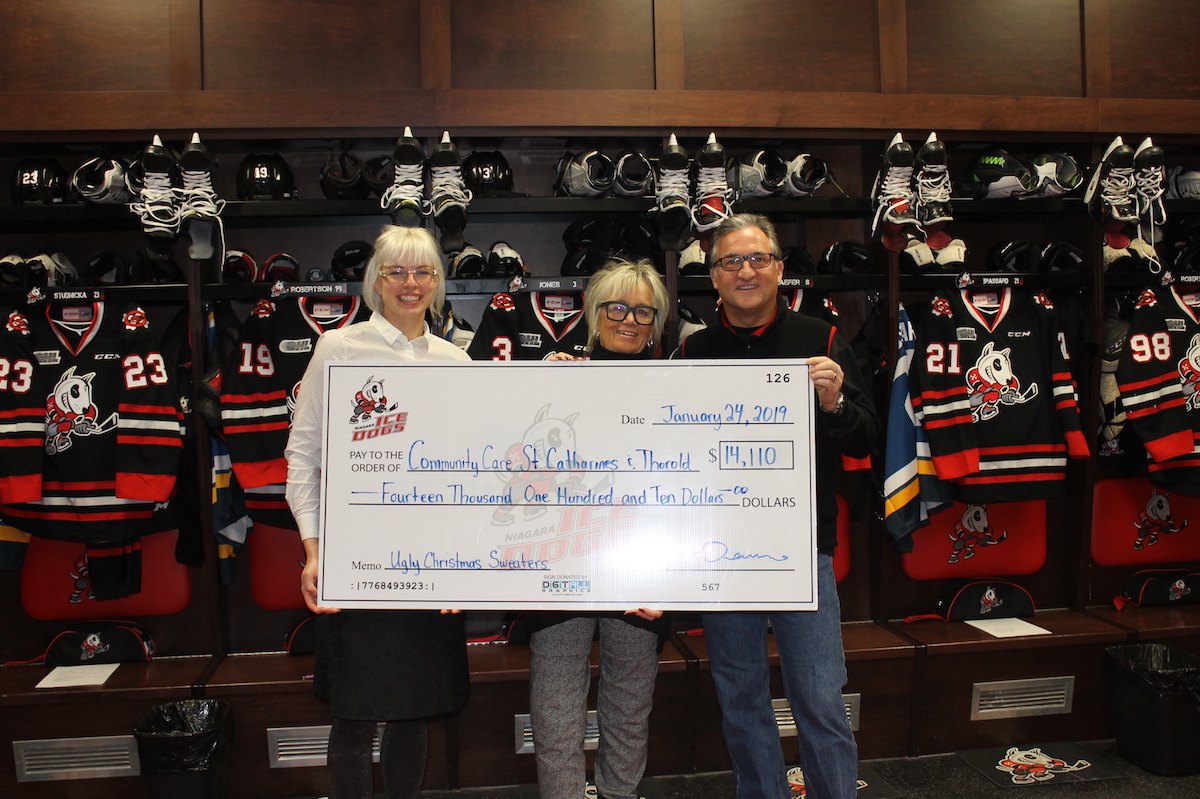 “We [Niagara IceDogs] are so proud to be donating such a significant amount of money to Community Care of St. Catharines & Thorold from our Ugly Christmas Sweater jersey auction.” Said Bill Burke, Owner of the Niagara IceDogs’. “We have had a longstanding relationship with Community Care. The work they do to provide our communities most vulnerable members with support and resources is incredible. To have received such strong support from our own fanbase for local organizations, like Community Care, shows what great work they do in our community.”