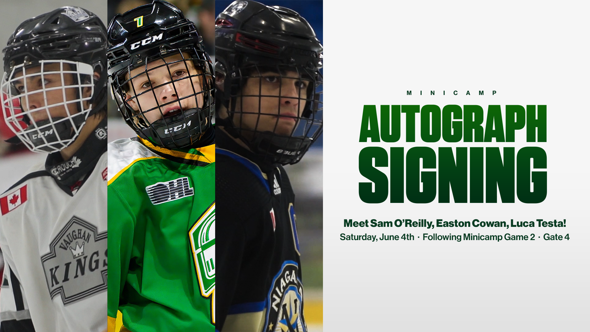 Saturday, June 4th, Knights’ Easton Cowan and newest 1st & 2nd round selections, Luca Testa and Sam O’Reilly will be signing autographs after the second minicamp game.