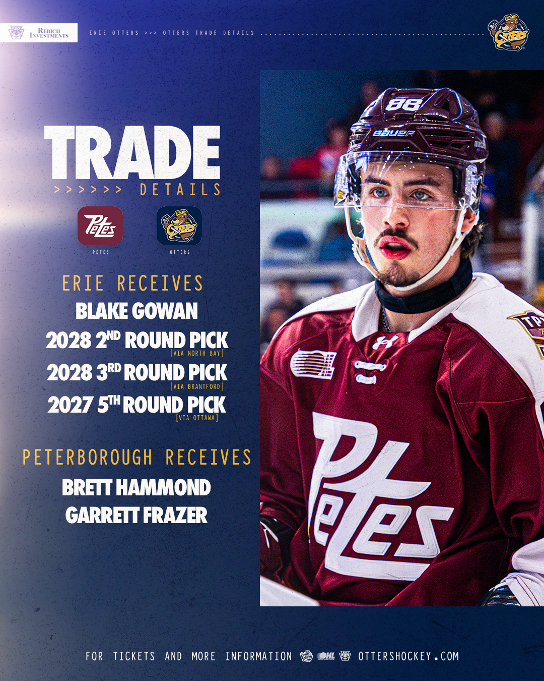 Single game tickets for the 2018-19 season are on sale now. Erie Otters season tickets and flex packages are also available and can be purchased in person at the Erie Otters front office located at 201 E. 8th Street in Erie, or by calling 814-455-7779. For the latest Otters news, visit www.ottershockey.com, or follow the team on Facebook (www.facebook.com/