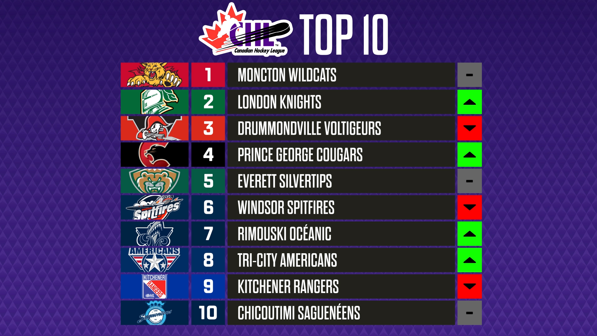 Having extended their point streak to eight games (7-0-1-0) with a pair of victories last week, the Moncton Wildcats of the Quebec Maritimes Junior Hockey League (QMJHL) are in the No. 1 spot for a fifth week in a row. Riding a nine-game winning streak, the London Knights of the Ontario Hockey League (OHL) are up to second in this week’s rankings, while the reigning QMJHL champion Drummondville Voltigeurs are down one spot in third.