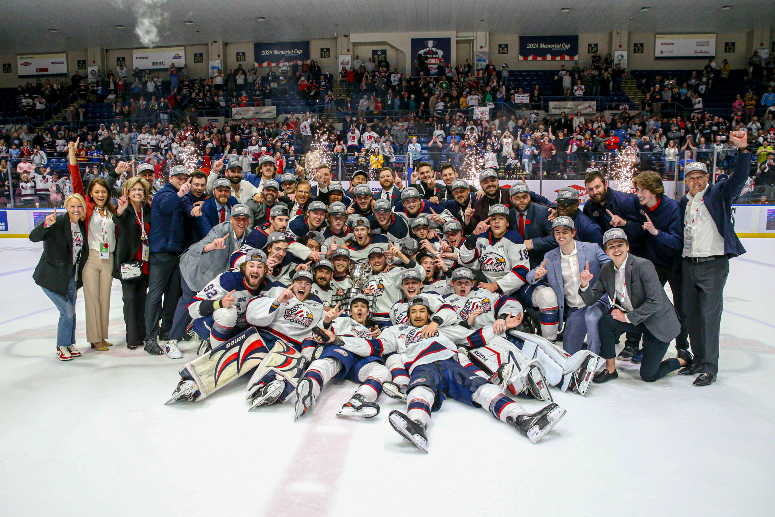 Saginaw, Mich. — The Saginaw Spirit defeated the London Knights, 4-3 at the Dow Event Center, Sunday June 2nd to win the 2024 Memorial Cup presented by Dow. Owen Beck scored twice to earn Tournament MVP, Josh Bloom collected three points (1G, 2A), and Joey Willis gathered one goal and one assist. Michael Simpson started for London stopping 27 of 31 shots and Andrew Oke stopped 10 of 13 in his first championship win.