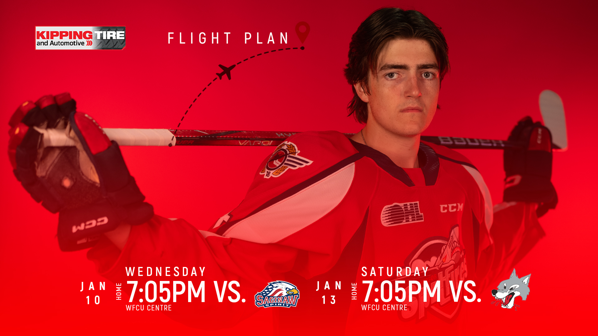Fans, this weeks Flight Plan presented by @kippingtire has us at home twice this week. Join us Wednesday at 7:05pm as we face off against @saginawspirit. Then join us for some Saturday night hockey as we tangle with @sudburywolvesohl. Tickets for both games are available online or at the box office on game days at 11:00am. #windsorspitfires #gospits