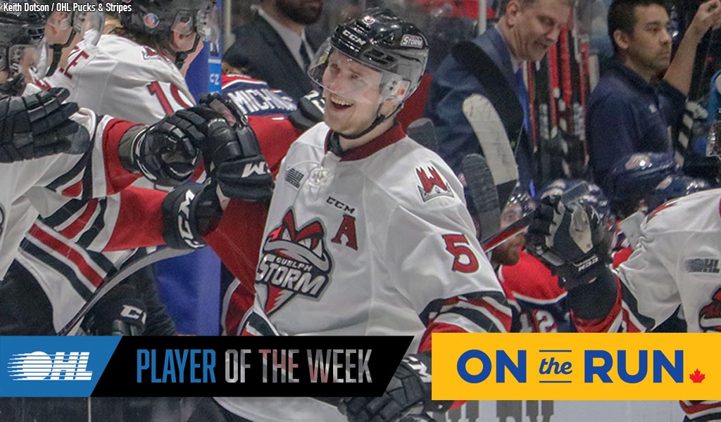 Toronto, ON – The Ontario Hockey League today announced that Edmonton Oilers prospect Dmitri Samorukov of the Guelph Storm is the OHL ‘On the Run’ Player of the Week for the playoff week ending April 28 with eight points in four games including four goals and four assists and a plus-minus rating of plus-5.