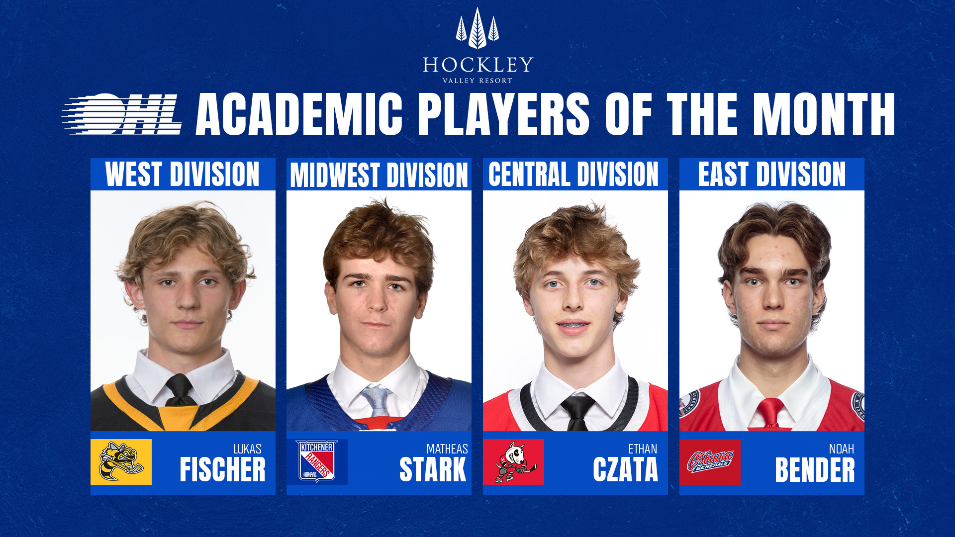 Toronto, Ont. – The Ontario Hockey League today announced that Matheas Stark of the Kitchener Rangers, Noah Bender of the Oshawa Generals, Ethan Czata of the Niagara IceDogs and Lukas Fischer of the Sarnia Sting have been named Academic Players of the Month for October proudly presented by Hockley Valley Resort.
