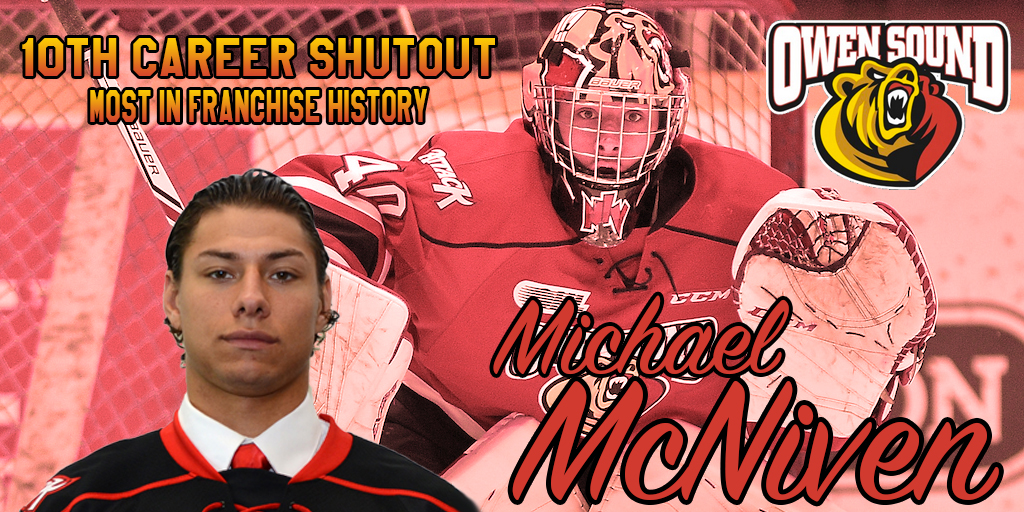 McNiven’s fifth shutout of the season and 10th (regular season) of his OHL career sees him surpass Jordan Binnington (2009-13) for the most in Owen Sound Attack franchise history. The 66th win of his OHL career also puts him ahead of Curtis Sanford (1996-2000) for second on the franchise’s all-time wins list behind Binnington (86).