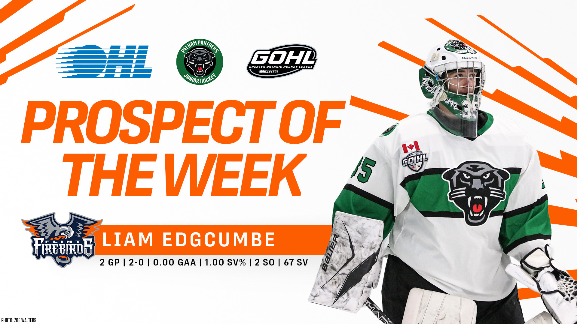 TORONTO – The Ontario Hockey League (OHL) today announced that Flint Firebirds prospect Liam Edgcumbe of the Pelham Panthers is the GOHL Prospect of the Week, stopping all 67 shots sent his direction in back-to-back shutouts.