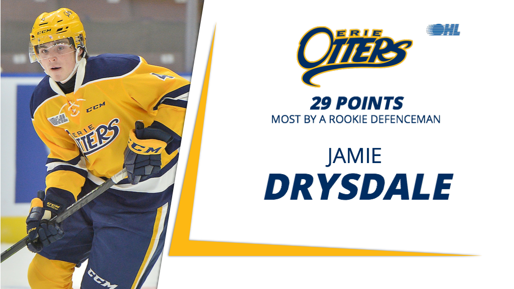 Drysdale picked up his 29th point of the season on the winner, surpassing Travis Dermott‘s 2013-14 mark of 28 for the most by a rookie defenceman in Otters franchise history.