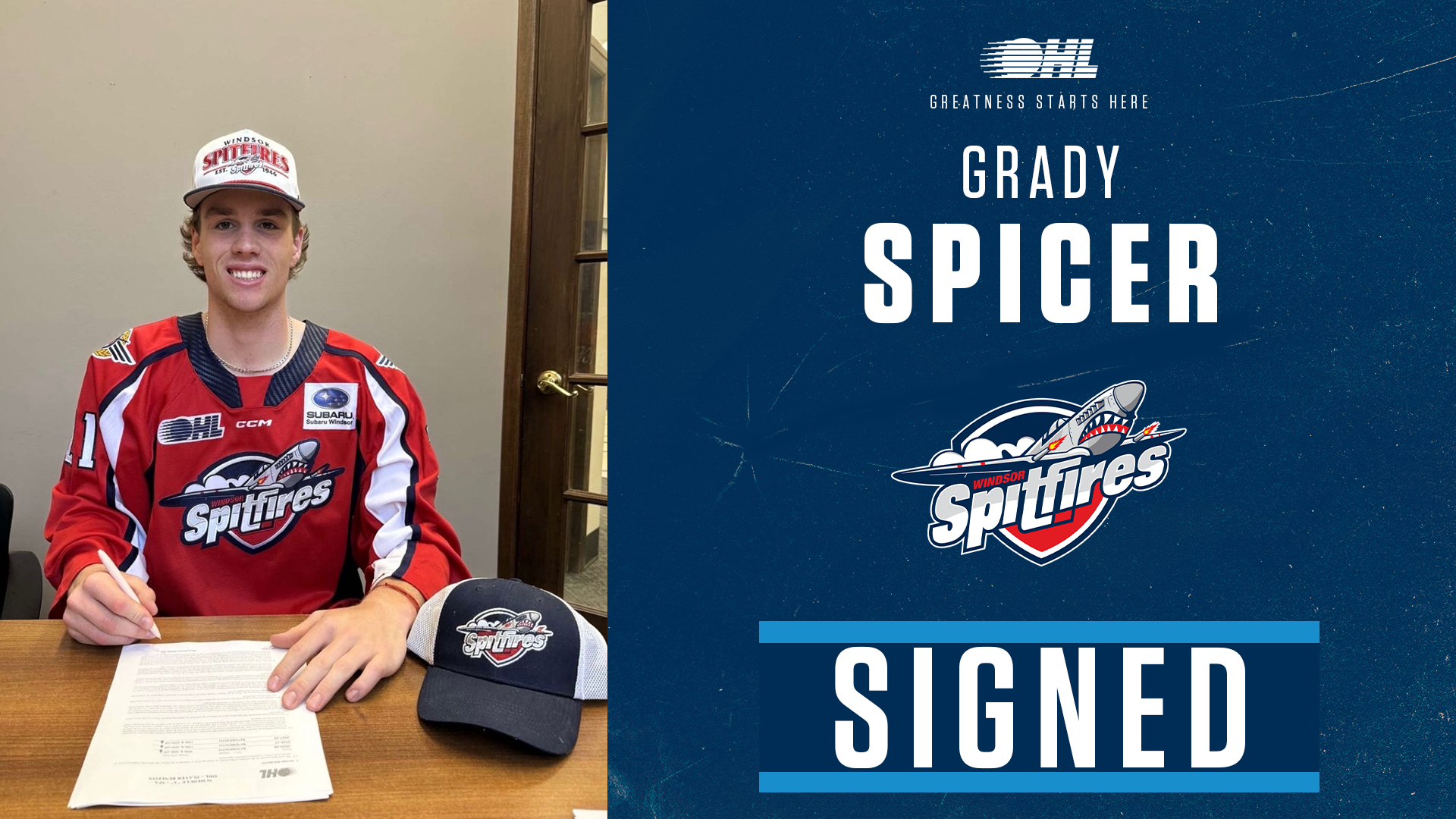 WINDSOR, ON – The Windsor Spitfires are proud to announce the signing of defenceman Grady Spicer to the Red, White and Navy!