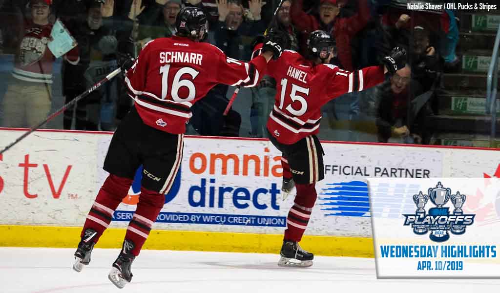 The Guelph Storm live to play another day, edging the London Knights 4-3 on home ice. Arizona Coyotes prospect Nate Schnarr (3, 4) gave Guelph its first lead of the series 4:24 into action and scored again 4:58 into the second. Nick Suzuki (6) scored less than a minute later and Liam Hawel (3) netted the third period game winner while goaltender Anthony Popovich turned in a 39-save performance. The Storm was outshot 42-31 as Popovich came up big on a number of occasions. Knights defenceman Adam Boqvist (9) scored in a third straight game while other London goals came from Billy Moskal (2) and Alec Regula (2). Jordan Kooy made 27 saves in the London crease as the Knights suffered their first loss of the playoffs. The Knights carry a 3-1 series lead into Game 5 back in London on Friday night.