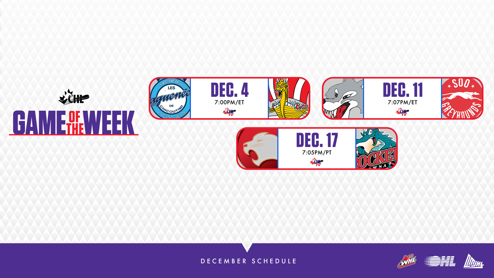 CHL Game of the Week schedule announced for December on CHL TV