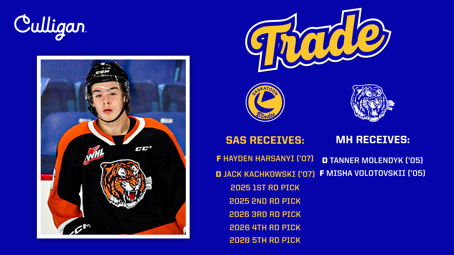 The Saskatoon Blades completed a blockbuster deal Monday evening with the Medicine Hat Tigers to usher in the next wave of Blades hockey. The Blades acquired 2007-born forward Hayden Harsanyi, 2007-born defenceman Jack Kachkowski, and five WHL Prospects Draft picks in exchange for Nashville Predators prospect Tanner Molendyk and 2005-born forward Misha Volotovskii. The picks coming Saskatoon’s way include: