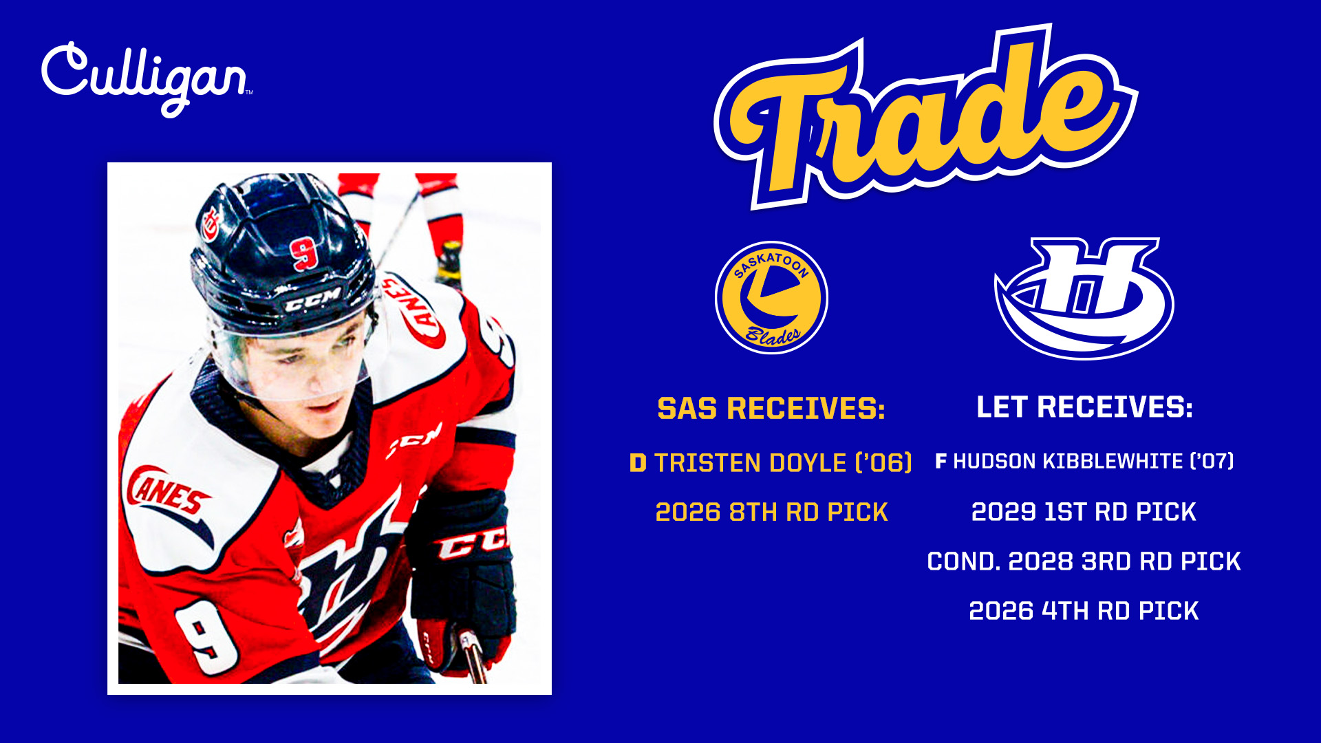 Saskatoon, SK – The Saskatoon Blades are excited to announce the acquisition of 19-year-old defenceman Tristen Doyle, and a 2026 eighth-round pick from the Lethbridge Hurricanes in exchange for 2007-born forward Hudson Kibblewhite, and three Western Hockey League (WHL) Prospect Draft picks.