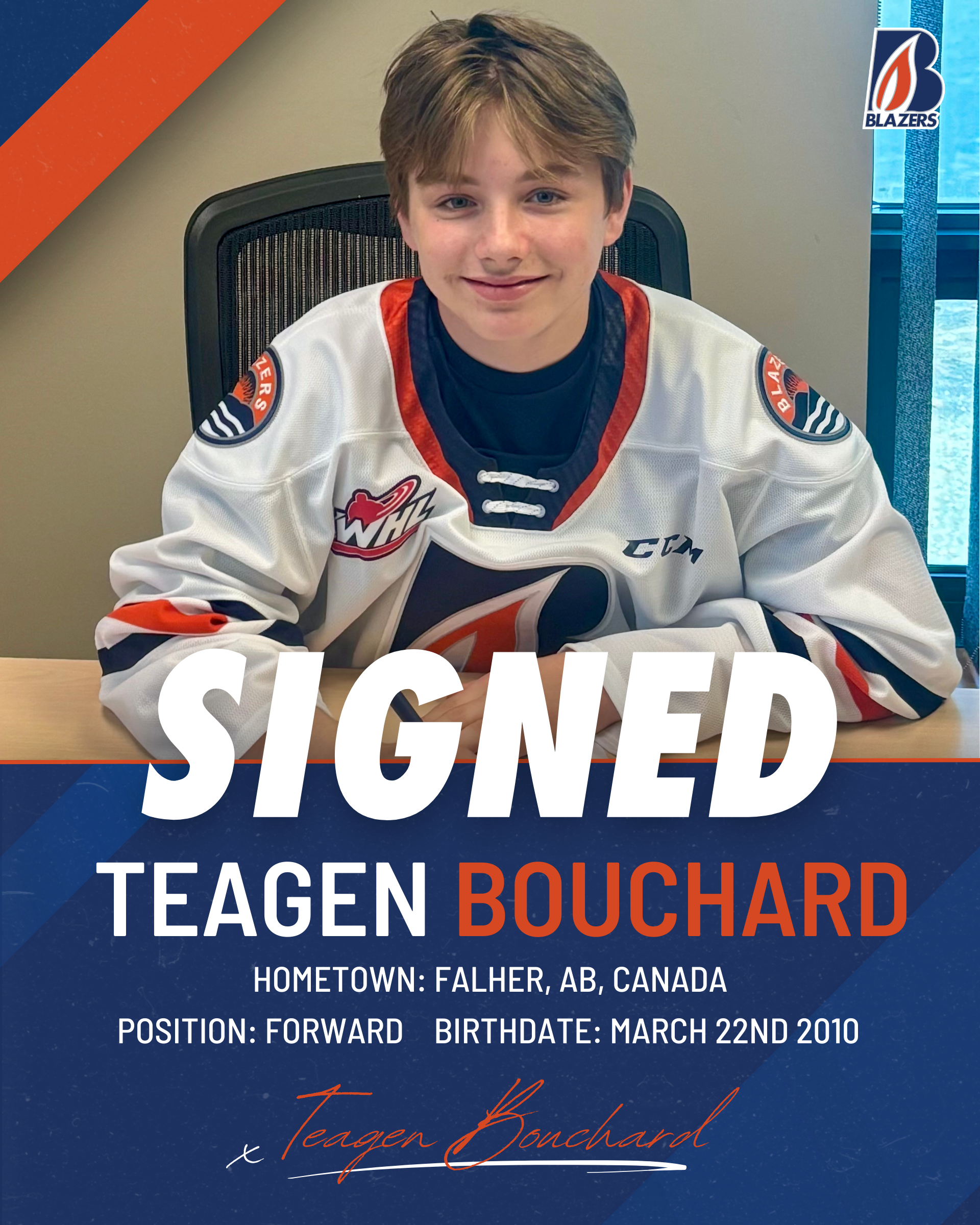 Kamloops, BC – The Kamloops Blazers have signed 2010-born forward Teagen Bouchard to a WHL Scholarship and Development Agreement. Bouchard was selected by the Blazers in the 1st round, 14th overall in the 2025 WHL Prospects Draft.
