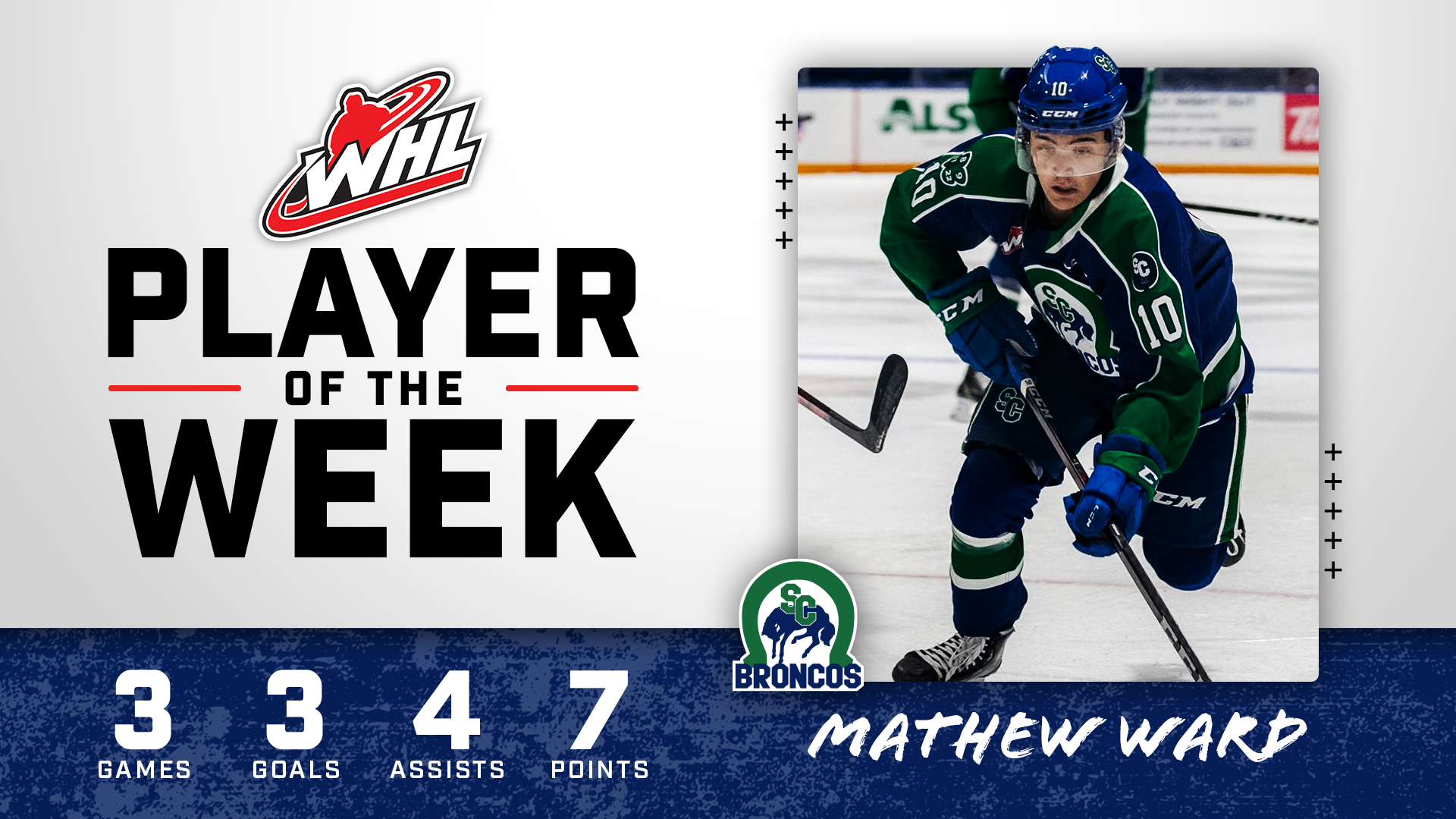 Ward, from Kamloops, B.C., played three games throughout the week recording three goals and four assists as the Broncos went 2-0-0-1.