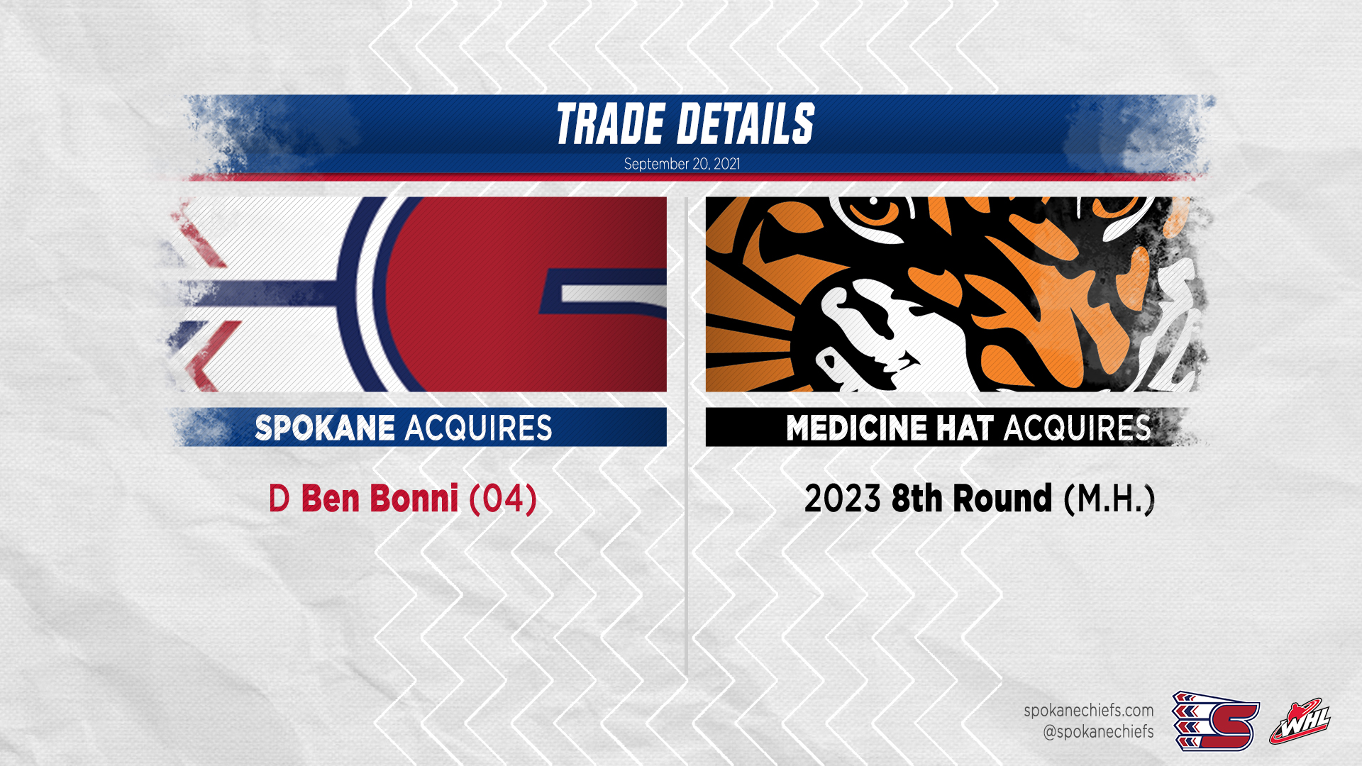 Spokane, Wash. — The Spokane Chiefs announced on Monday that they have acquired defenseman Ben Bonni from the Medicine Hat Tigers in exchange for an eighth-round pick in the 2023 WHL Draft.