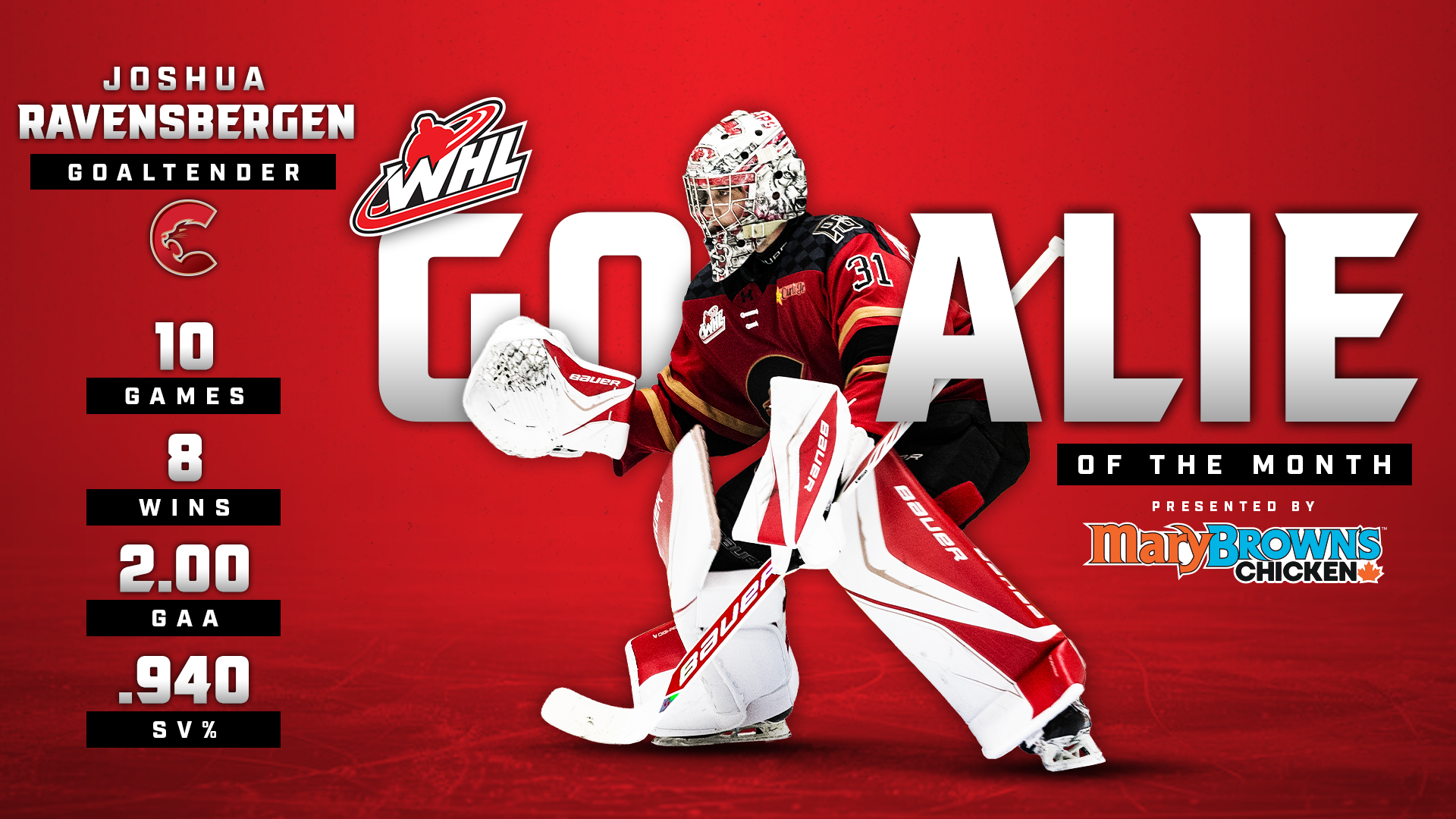 Funk, 20, has crafted one of the most remarkable single seasons in Prince George Cougars’ history. Amassing an impressive 99 points with 56 goals and 43 assists in 58 games, the Coldstream, BC native has not only become the Cougars’ single-season goal leader but has also set records for the most hat-tricks (8) and the highest number of power-play goals in a single season, leading the WHL with 25 power-play goals. Additionally, Funk holds the top position among all WHL skaters in plus-minus with a remarkable +44.