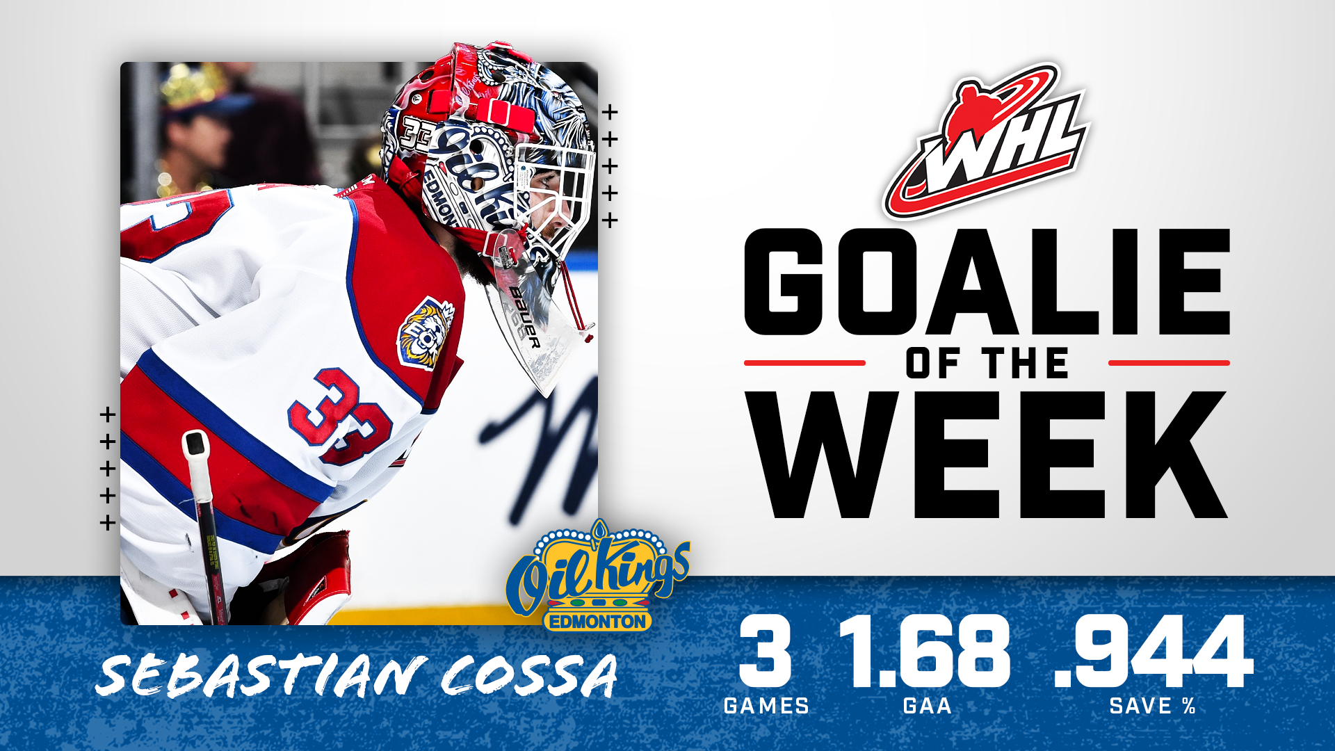 Calgary, Alta. – The Western Hockey League announced today that Edmonton Oil Kings goaltender Sebastian Cossa has been named WHL Goaltender of the Week for the week ending June 12, 2022.