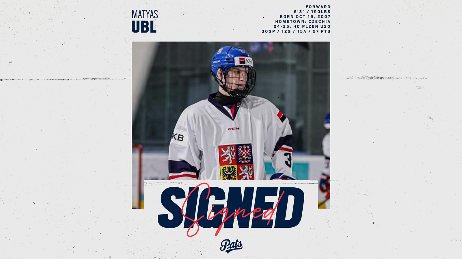 To complete a Draft Day Considerations trade with the Brandon Wheat Kings, the Pats acquired 18-year old forward Geordie Maguire and a third round pick which the Blue and White used to add 6’3”, 185 lbs. forward Luc Smith. Maguire comes to the Pats after playing his rookie season in Brandon while Smith totaled 43 points in 29 games of AMBHL action this past season.