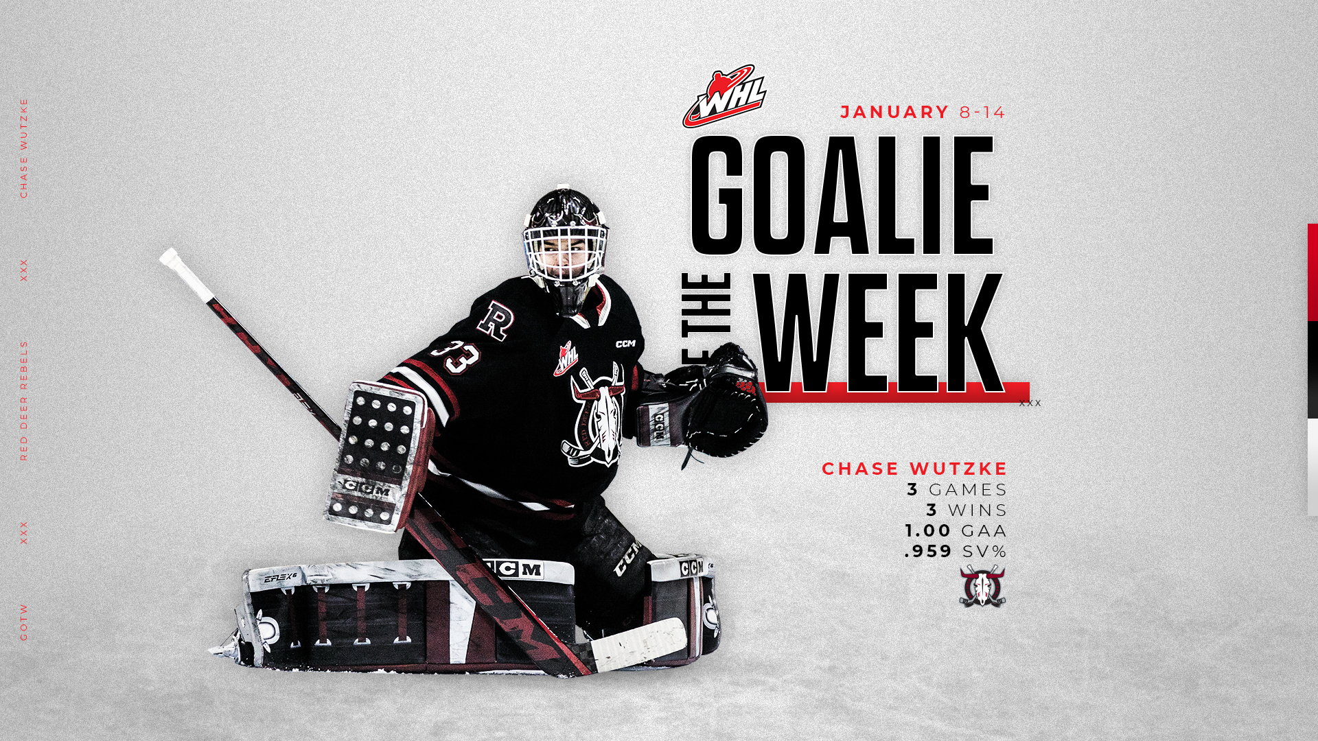 Calgary, Alta. – The Western Hockey League announced today that Red Deer Rebels netminder Chase Wutzke has been named WHL Goaltender of the Week for the week ending January 14, 2024.