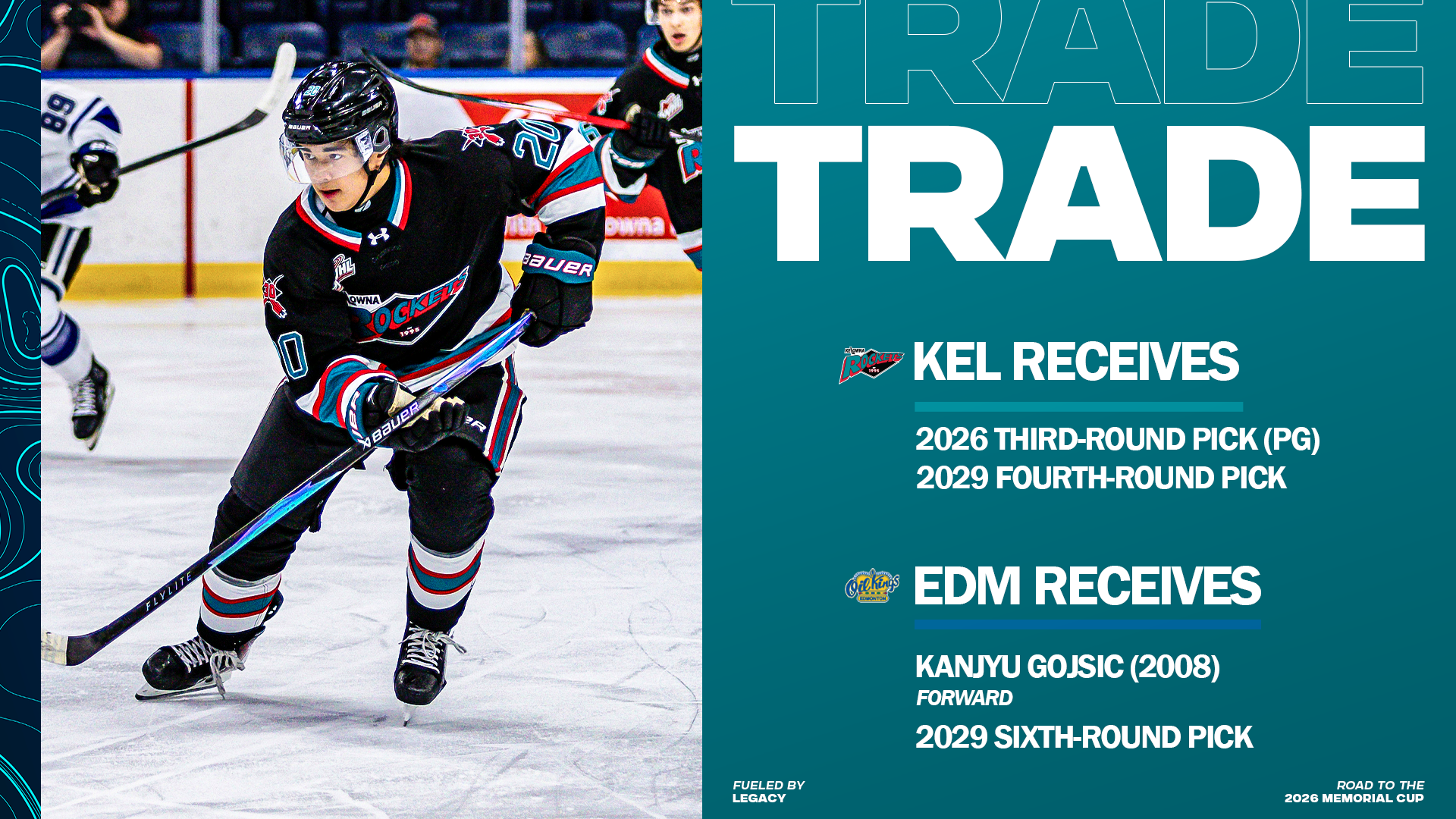KELOWNA, BC – The Kelowna Rockets announced today that they have traded forward Kanjyu Gojsic (2008) and a sixth-round pick…