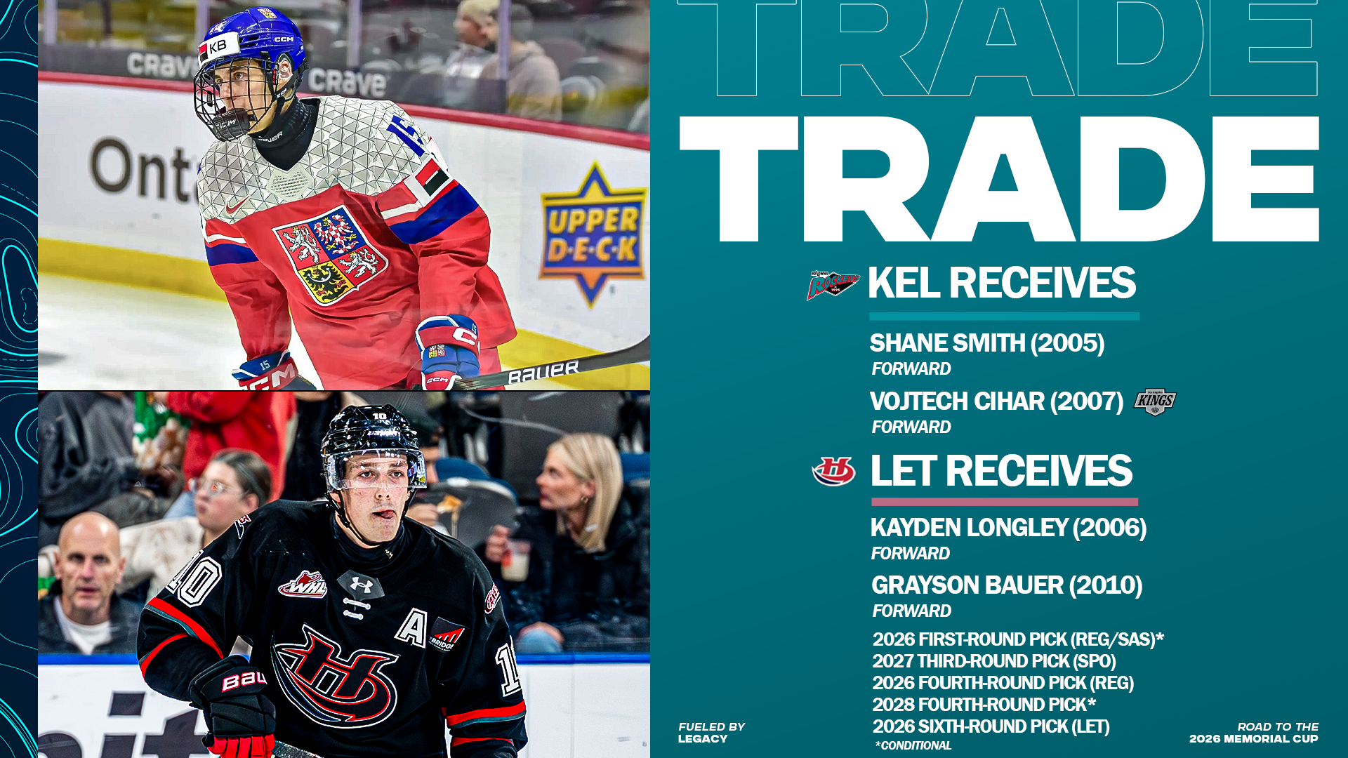 KELOWNA, BC – The Kelowna Rockets have acquired forwards Shane Smith and Vojtech Cihar from the Lethbridge Hurricanes in exchange…