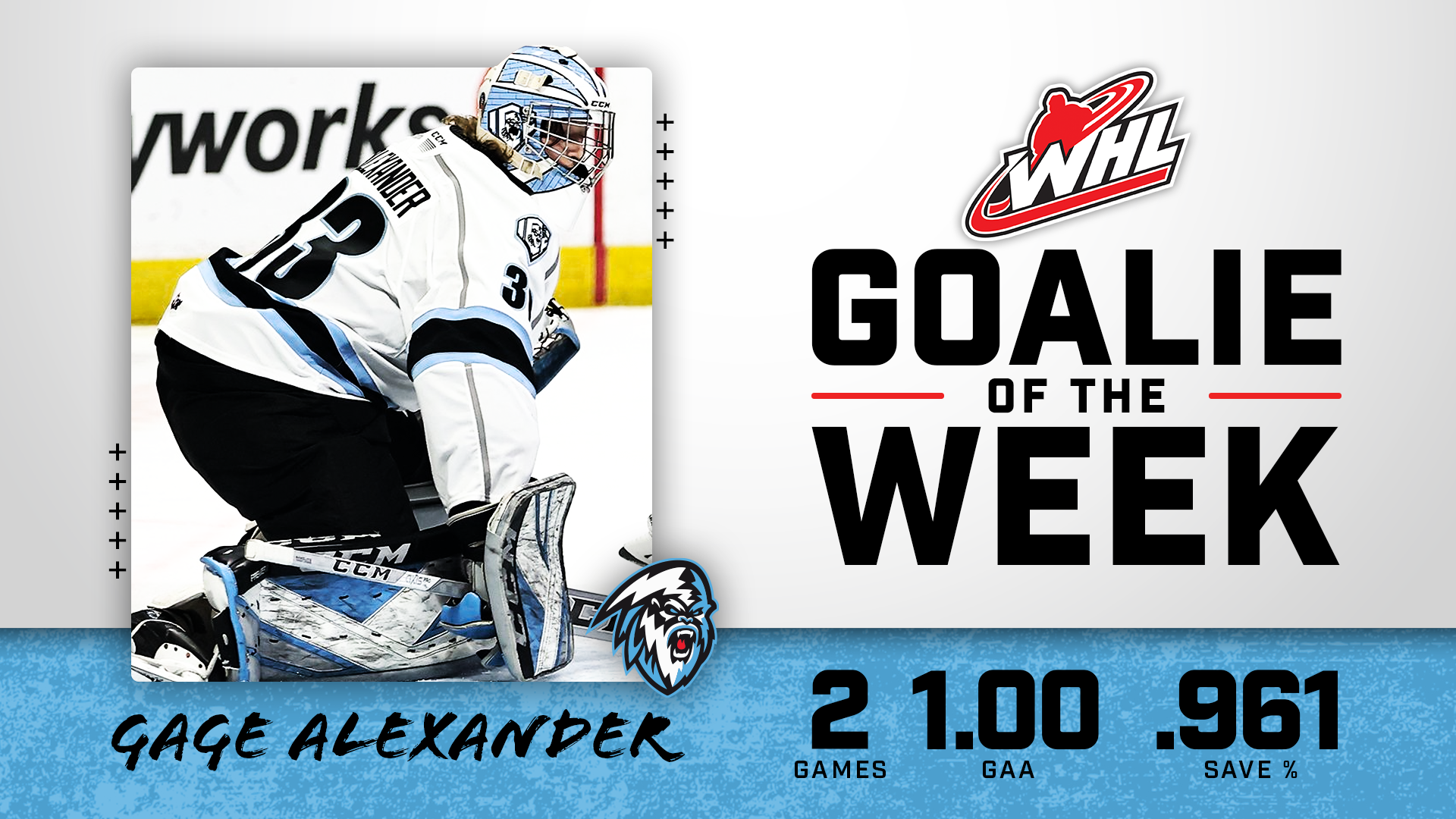 The Western Hockey League announced today that Winnipeg ICE goaltender Gage Alexander has been named WHL Goaltender of the Week for the week ending November 14, 2021.