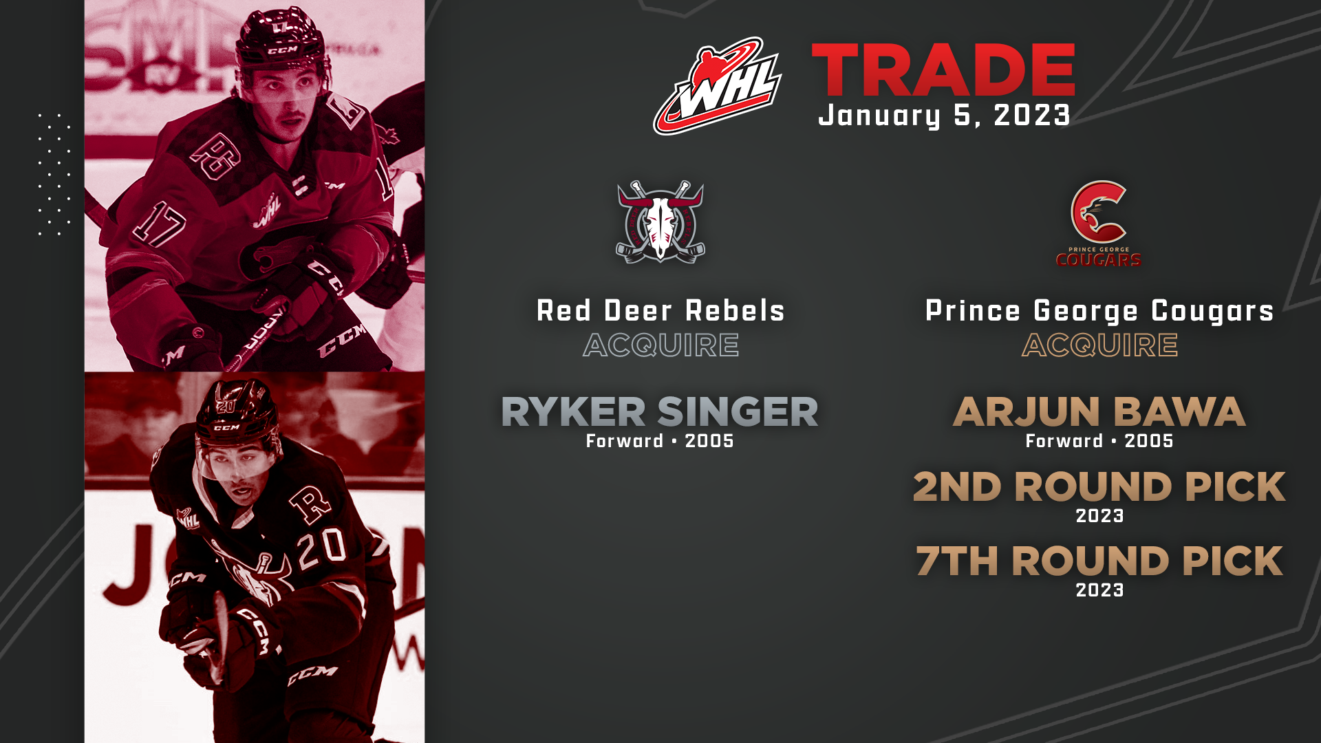 The Red Deer Rebels have acquired forward Ryker Singer from the Prince George Cougars in exchange for fellow 17-year-old forward Arjun Bawa, as well as second- and seventh-round selections in the 2023 WHL Prospects Draft.