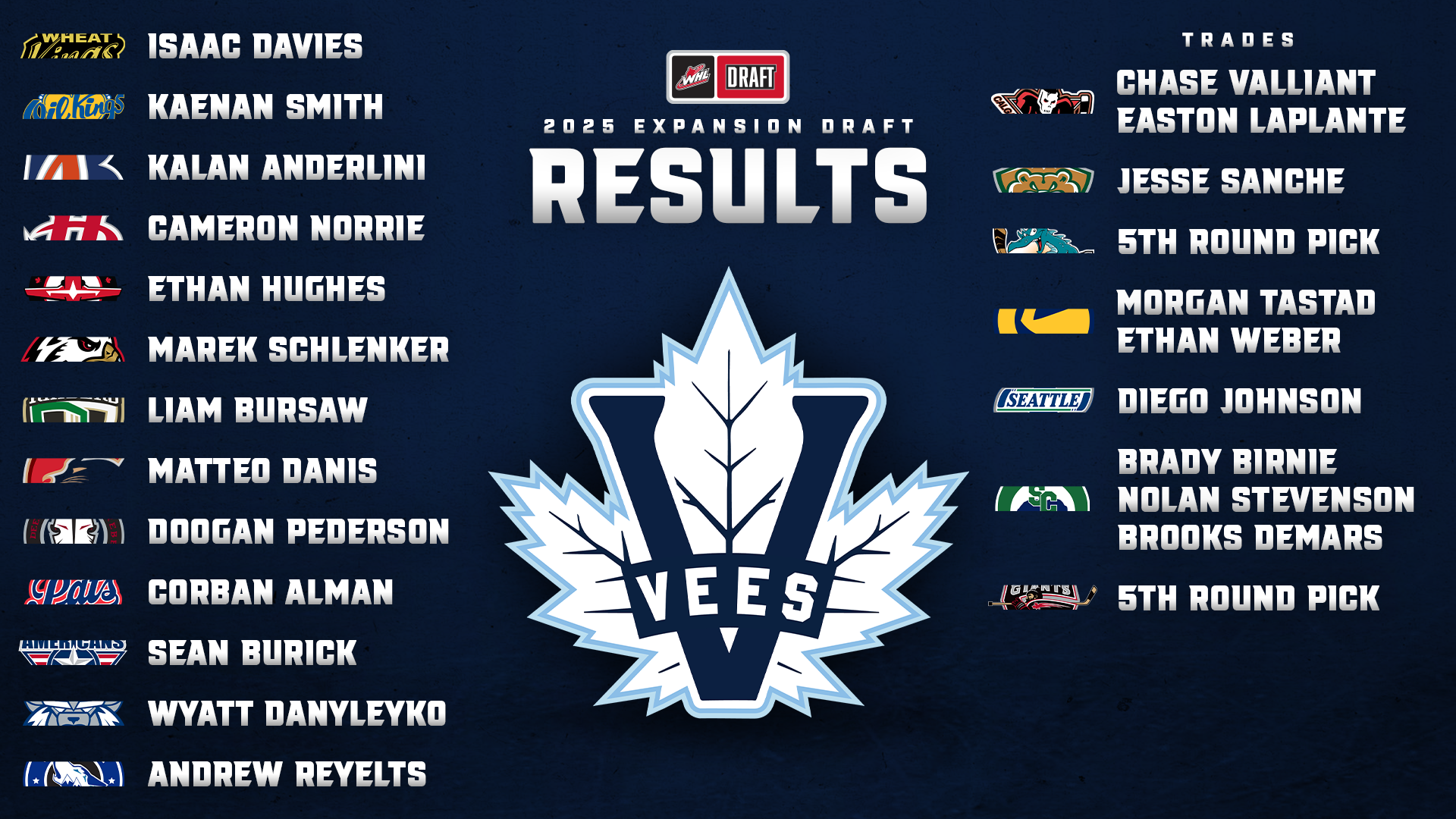 The Vees selected one player from each of 13 WHL Clubs, while agreed upon trades involving seven WHL Clubs were accepted in place of expansion draft selections. The Medicine Hat Tigers and Spokane Chiefs have been granted an accommodation based on advancing to the 2025 WHL Championship Series presented by Nutrien.